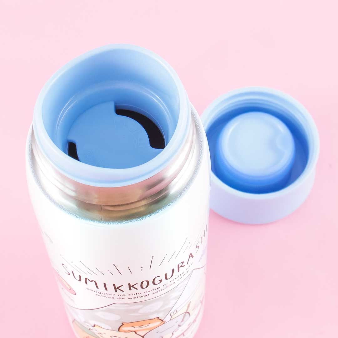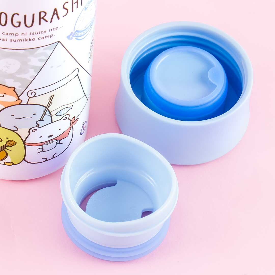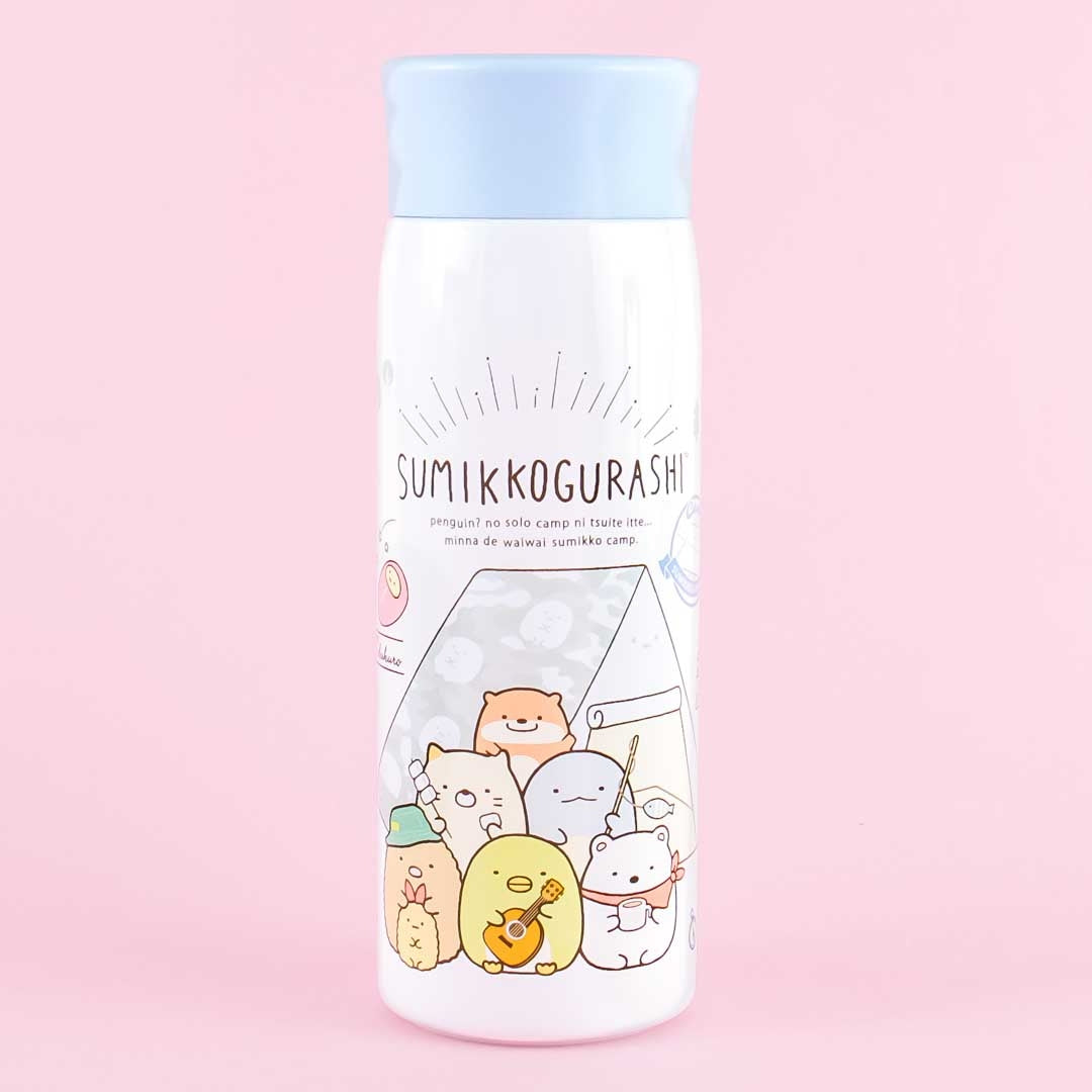 • A kawaii stainless steel bottle illustrated with the Sumikko Gurashi gang camping