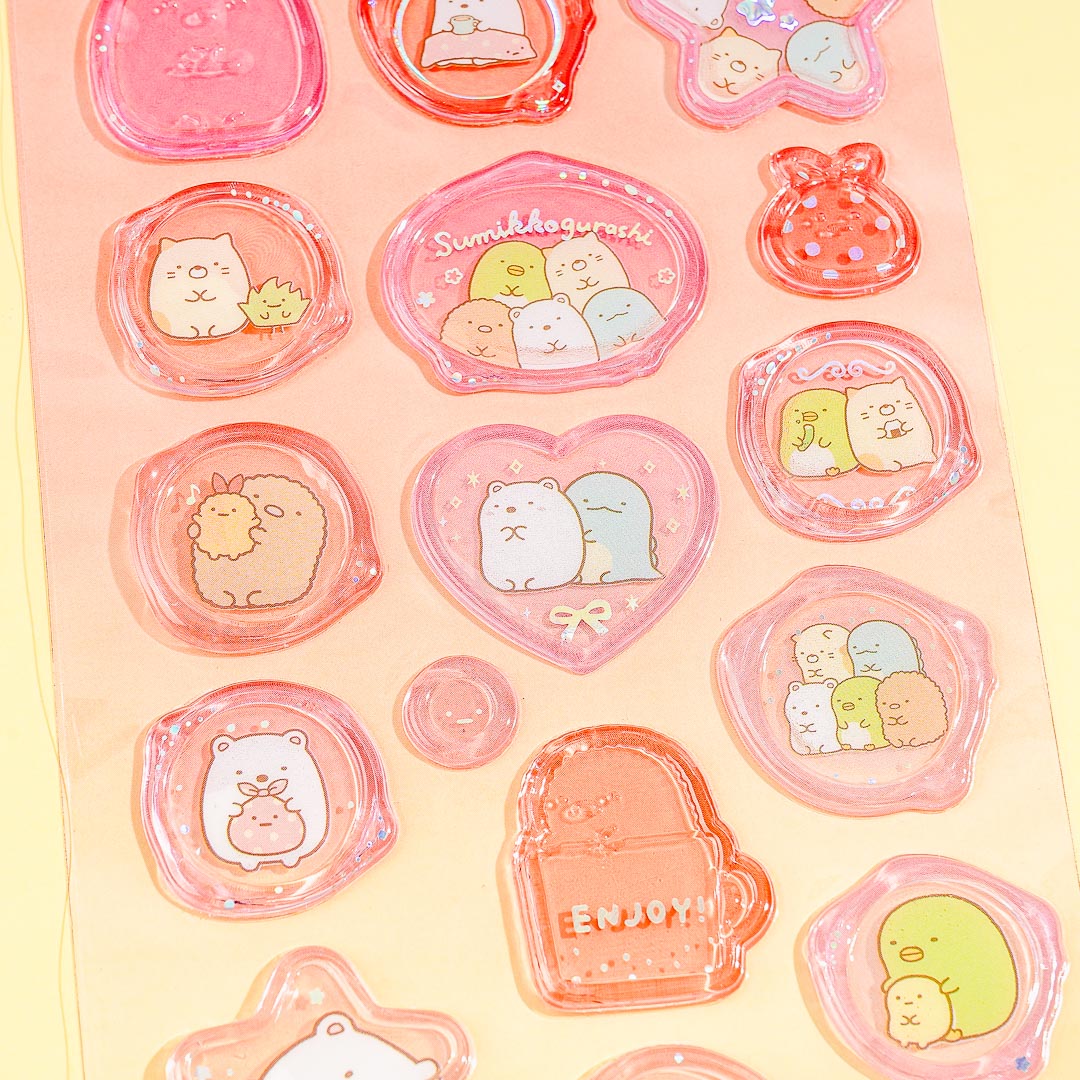 These stamp-like stickers have kawaii prints of the Sumikko Gurashi gang! Each die-cut piece is filled with glitters as well. Use this super cute set to decorate your birthday invites!