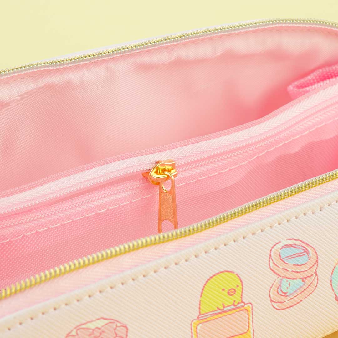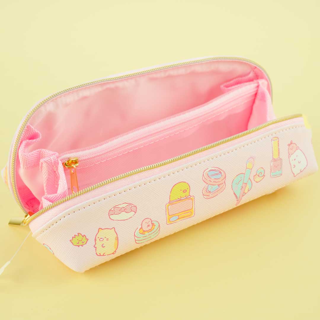 Keep your favorite pens and pencils inside this slim pouch! It’s decorated with illustrations of the Sumikko Gurashi characters holding cosmetics! The case a has a unique double zipper closure that opens the case horizontally.