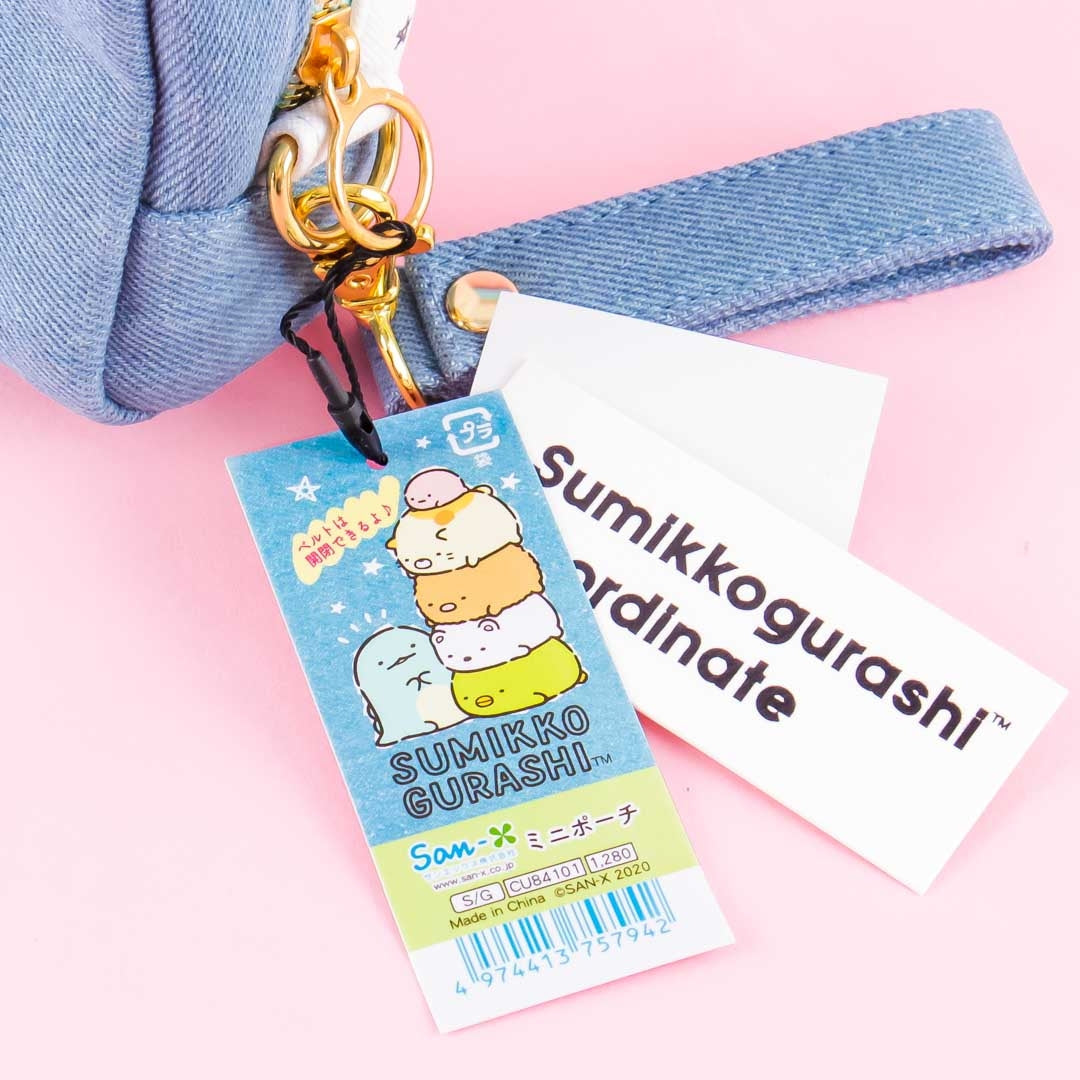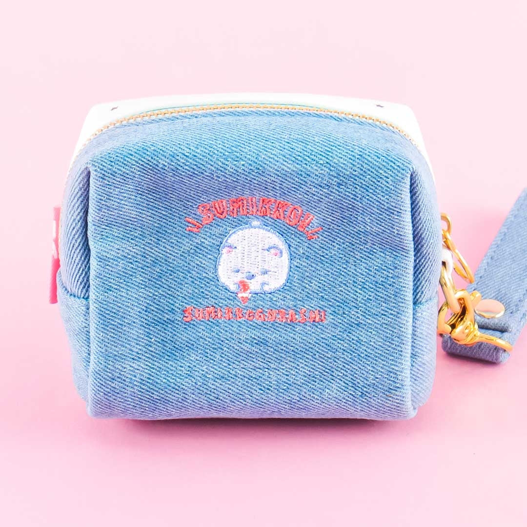 A kawaii denim pouch featuring Sumikko Gurashi characters having fun