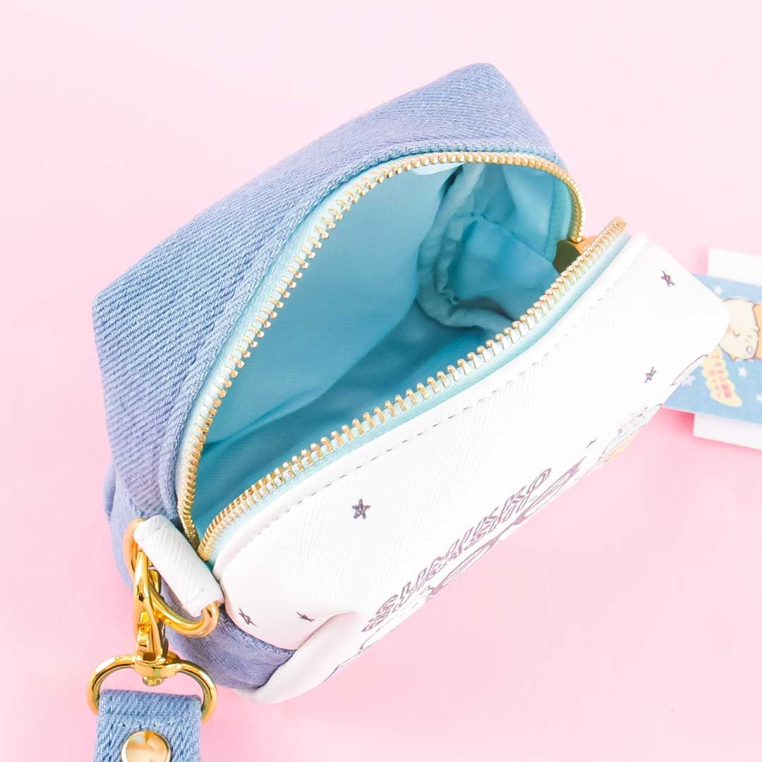 This kawaii pouch features the Sumikko Gurashi gang having fun! It is made of denim fabric on one side and synthetic leather on the other. The denim part has a super cute Shirokuma embroidery! You can carry your make-up, hair ties, and other accessories everywhere safely with its zipper closure! It also comes with a detachable denim strap!