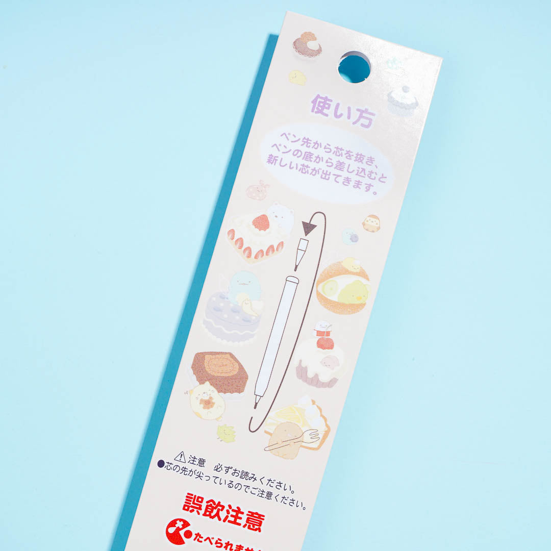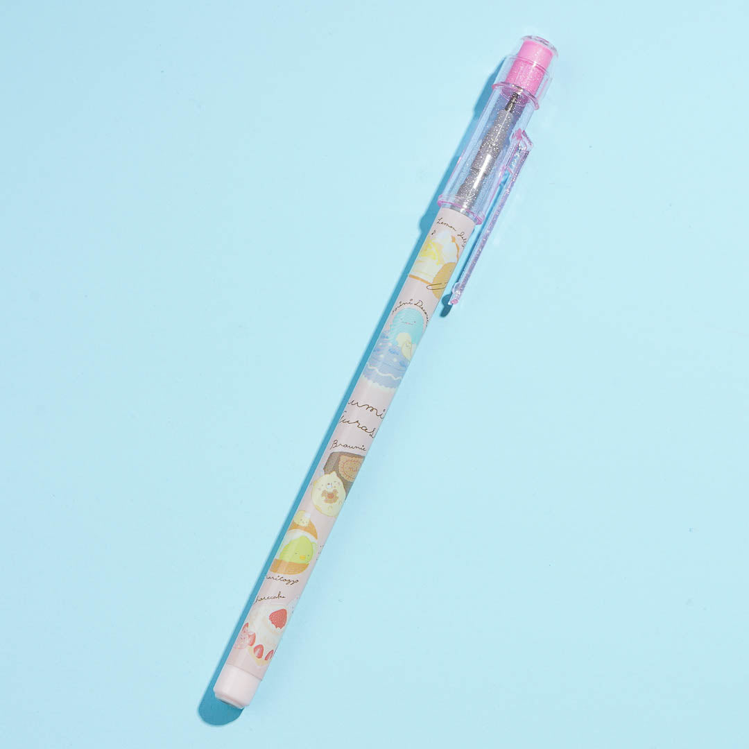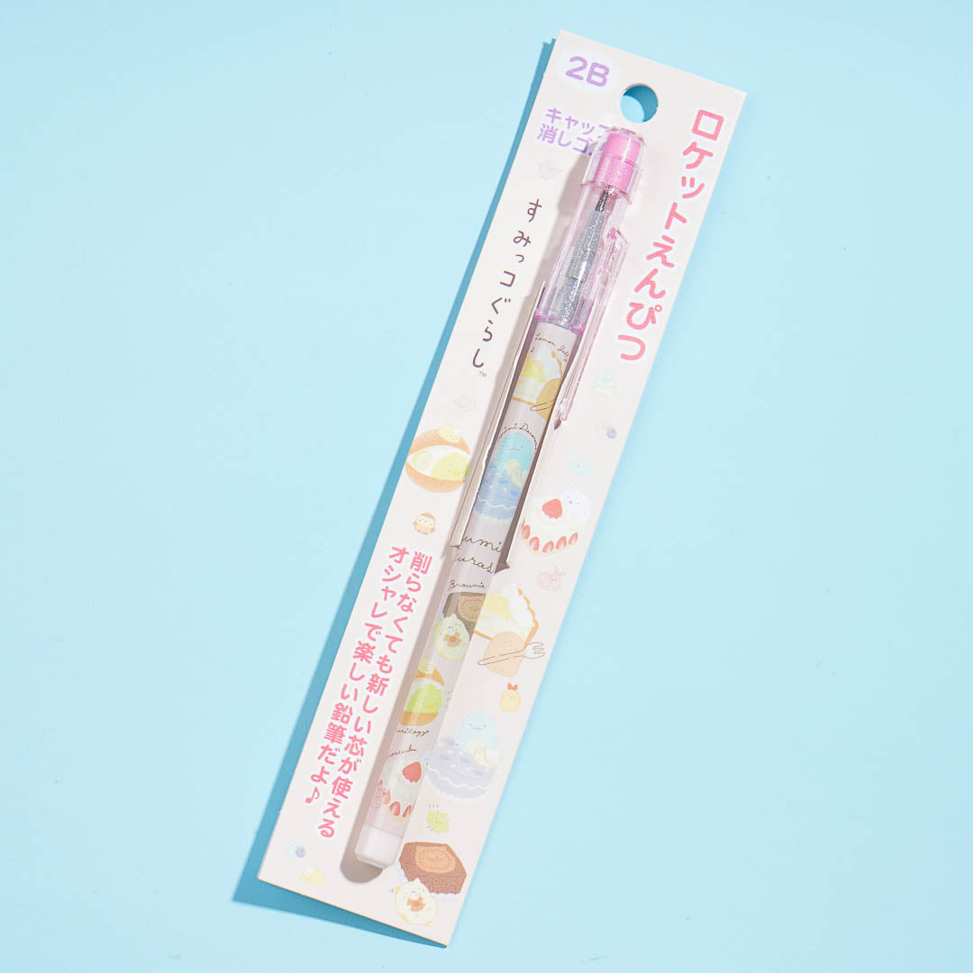 Practice sketching and drawing with this kawaii rocket pencil. It's illustrated with prints of the Sumikko Gurashi playing with giant desserts! This stacking point pencil has a 2B core.