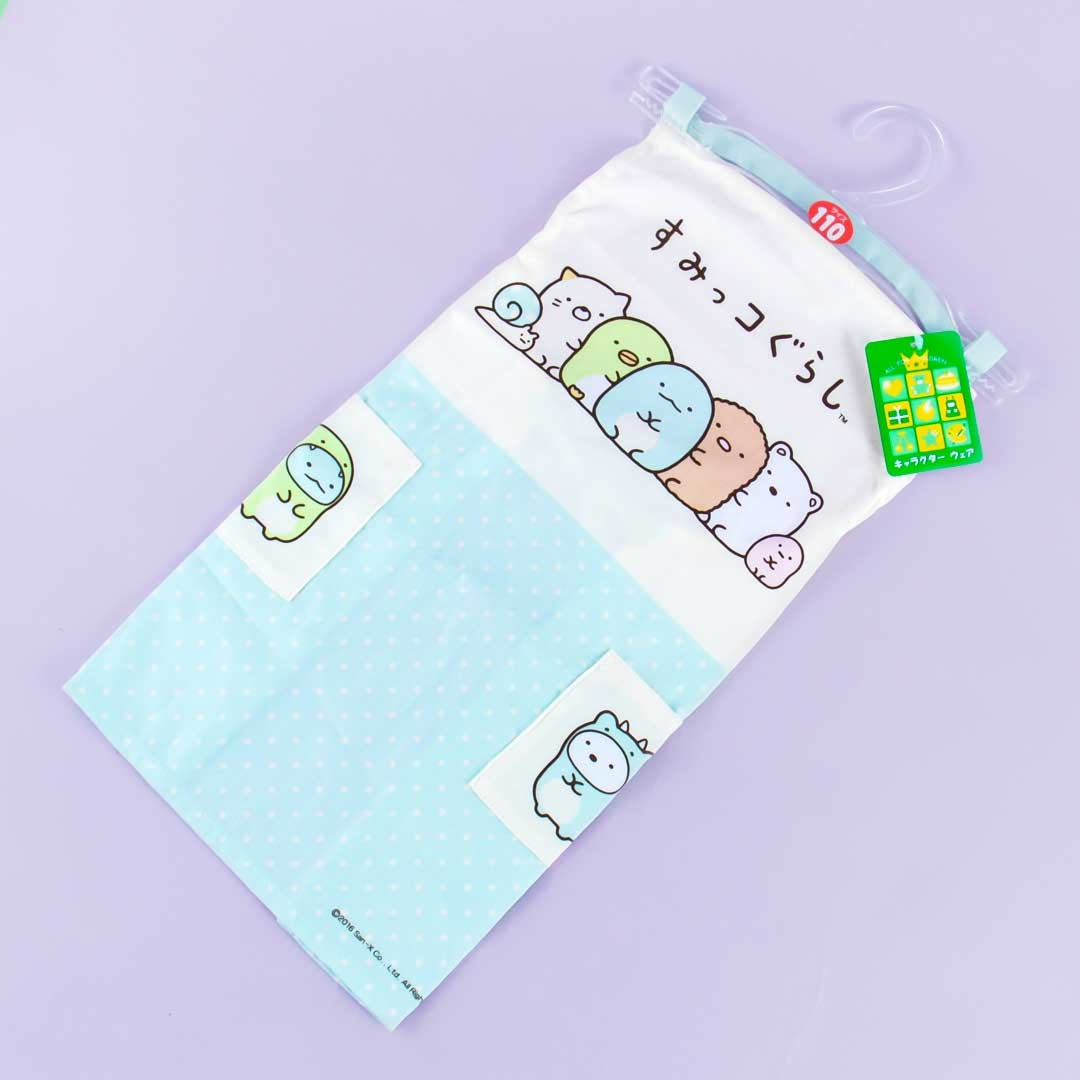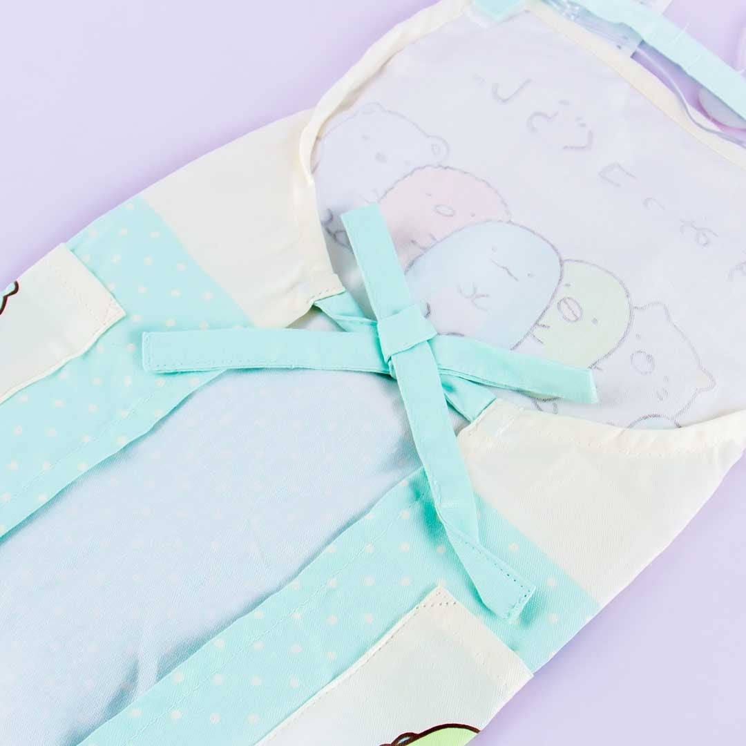 A kawaii kiddie-sized apron illustrated with the Sumikko Gurashi gang
