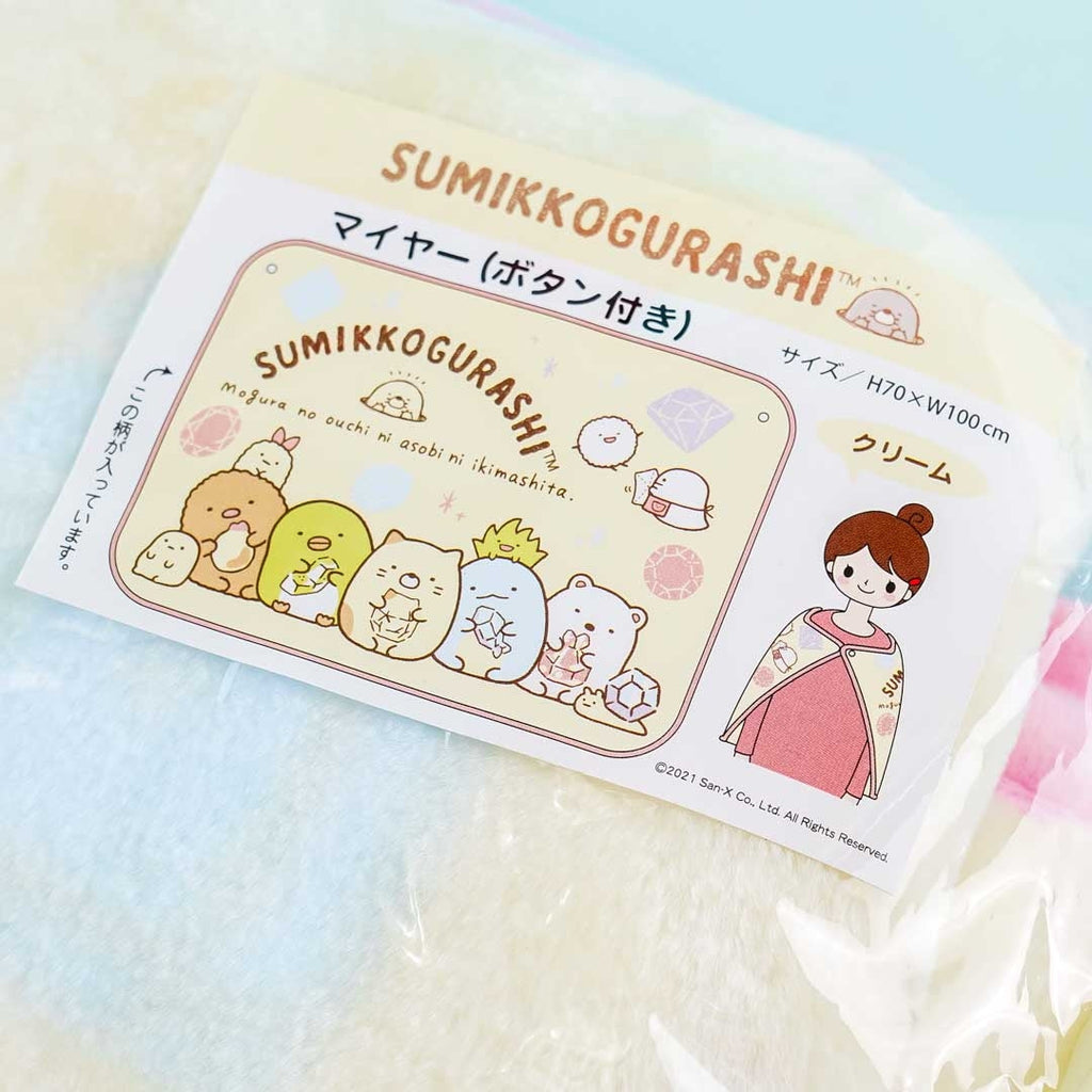Warm yourself up with this super kawaii blanket featuring Sumikko Gurashi characters holding their cute dolls. It's made of special Meyer fabric that has a soft, hair-like texture. You can wear it on your shoulders or wrap it around your waist by snapping the button on the top corner.