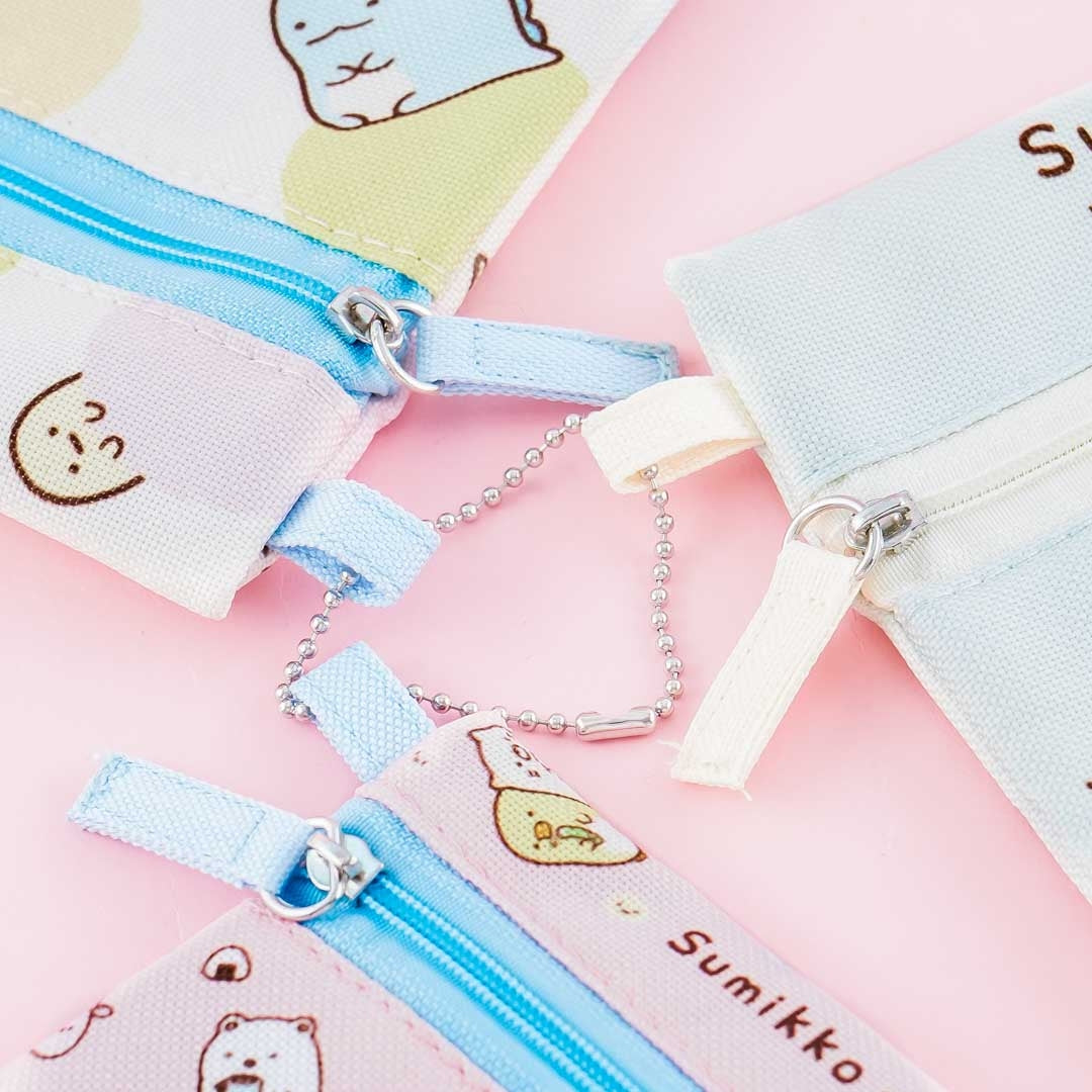 Keep your bags organized by separating your stuff using this set of flat pouches! It features illustrations of Sumikko Gurashi characters. The set comes with a removable ball chain so you can keep them all together!