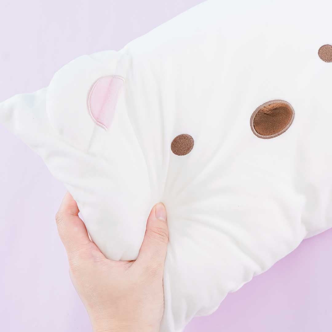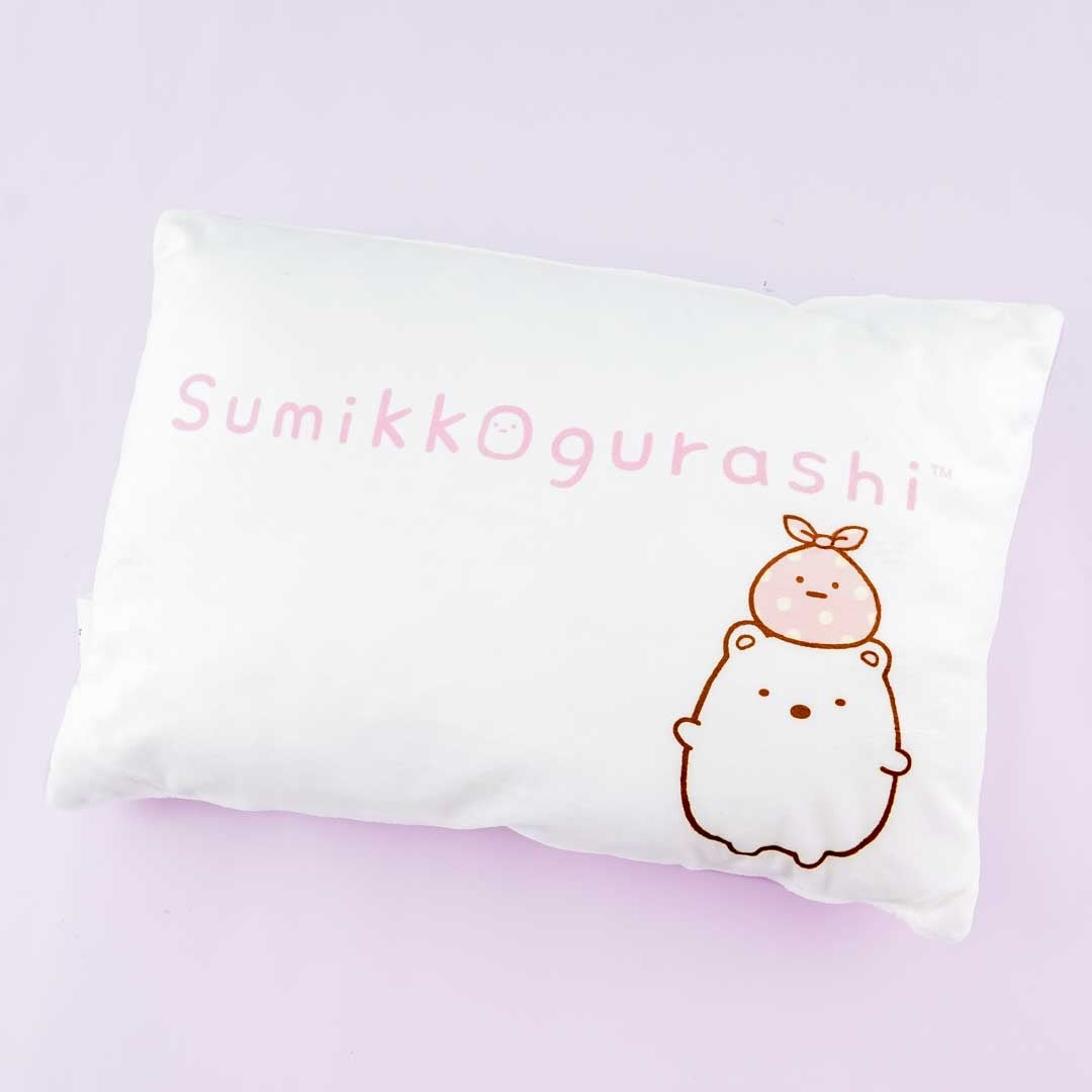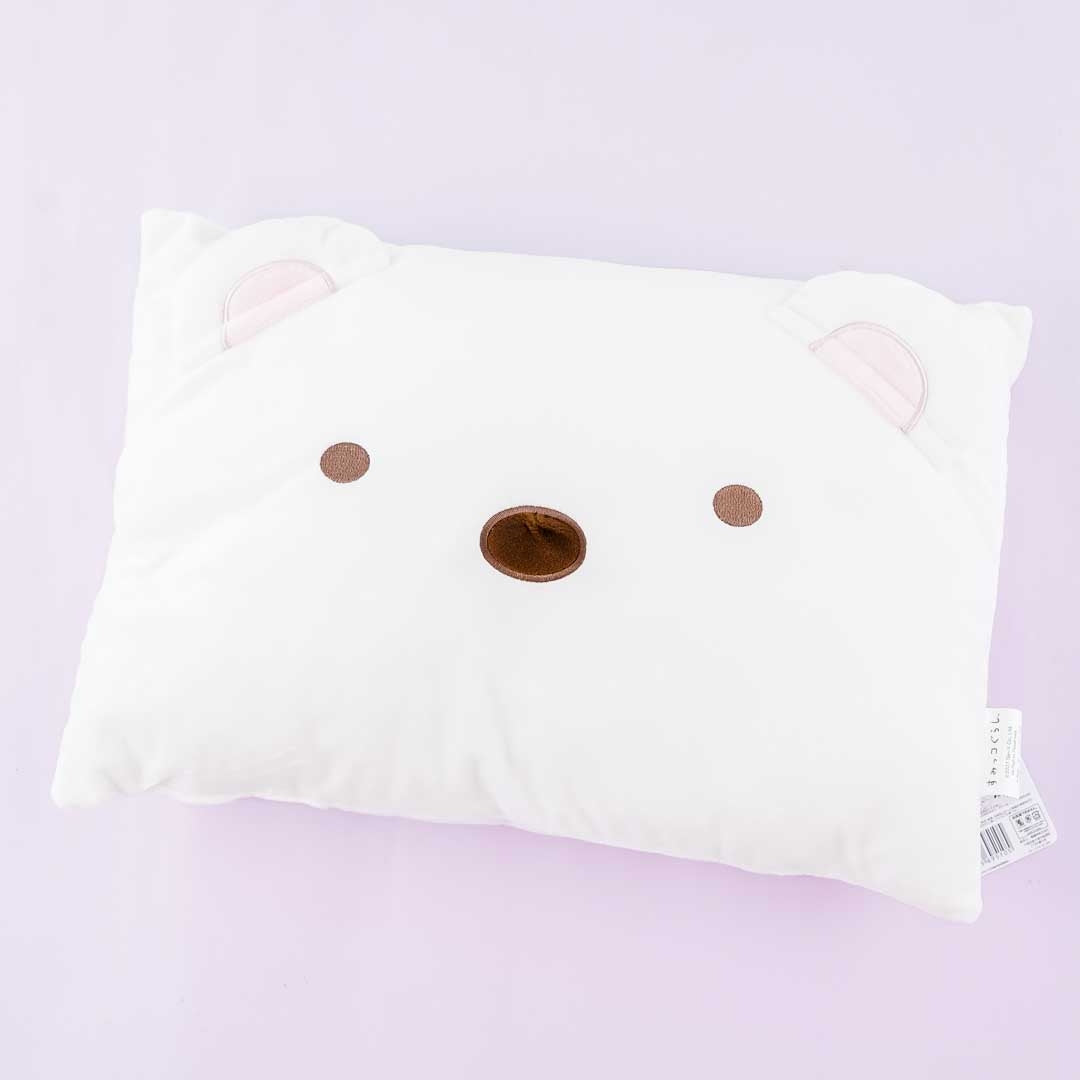 A kawaii cushion with embroidered face details of Shirokuma from Sumikko Gurashi