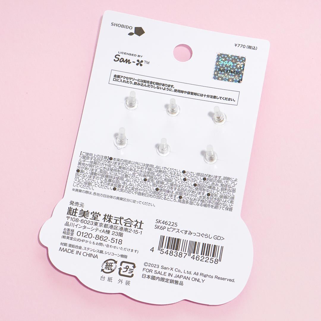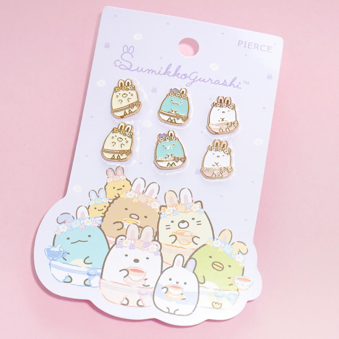 Add this cute set of earrings to your jewelry box. It showcases the Sumikko Gurashi wearing cute flower bunny outfits! These earrings have nice golden accents to them. You need pierced ears to wear these kawaii accessories.