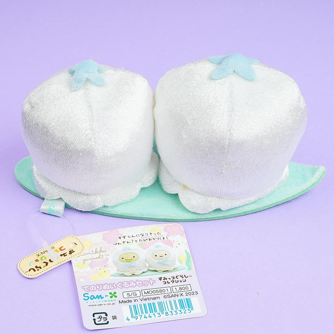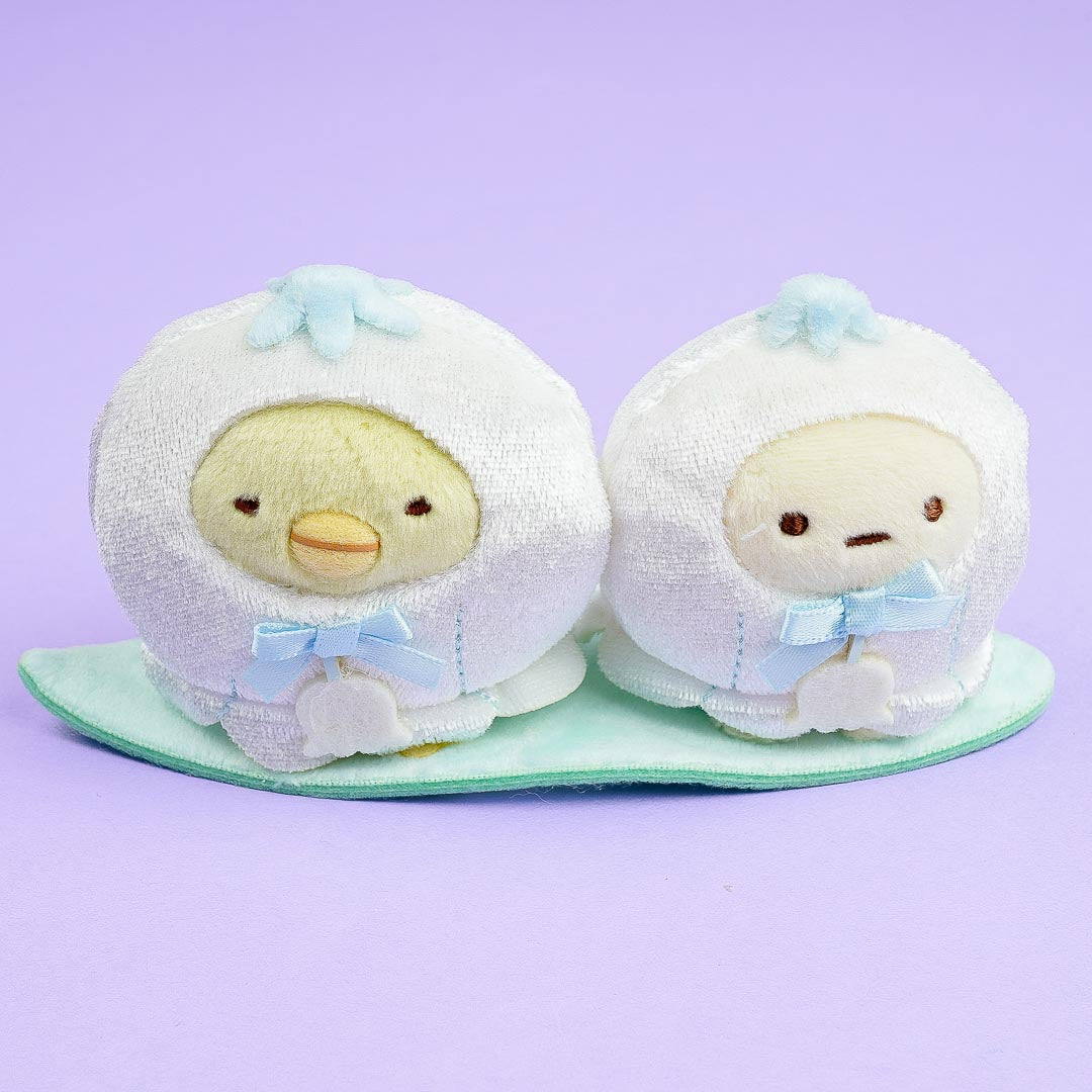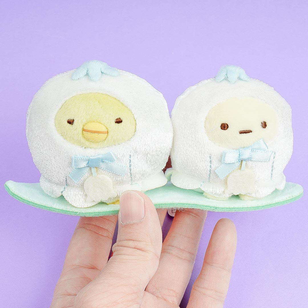 Enjoy playing with this kawaii pair of Sumikko Gurashi plushies! Penguin? and Tapioca are dressed as cute lilies of the valley. The mini plushies are attached to a soft leaf-shaped base so they cannot be separated.