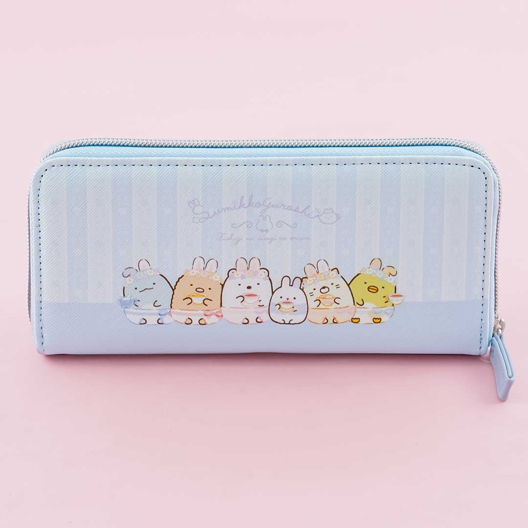 A kawaii long wallet illustrated with the Sumikko Gurashi dressed as flowery bunnies