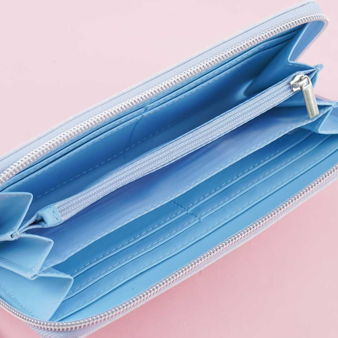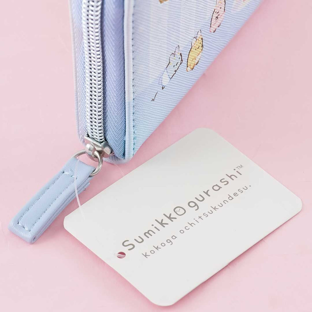 Keep your cards and cash inside this cute long wallet. It's covered in prints of the Sumikko Gurashi dressed as flowery bunnies! This wallet has multiple card slots. compartments, a zippered pocket for coins, and a zipper closure.