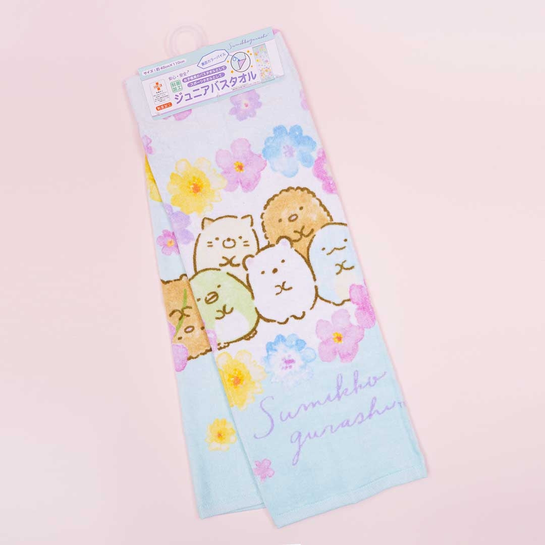 • A kawaii thin bath towel decorated with prints of the Sumikko Gurashi surrounded by flowers