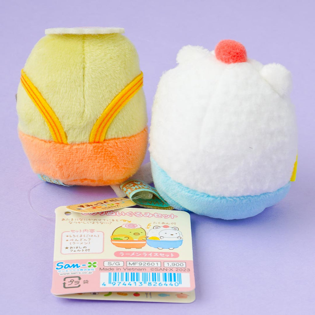 Shirokuma is dressed like a bowl of rice with plum, while Penguin? is in a ramen-inspired outfit! Snuggle soundly with these two cuties while you take a nap. You can also play with these mini Sumikko Gurashi Food Kingdom plushies with your bestie!
