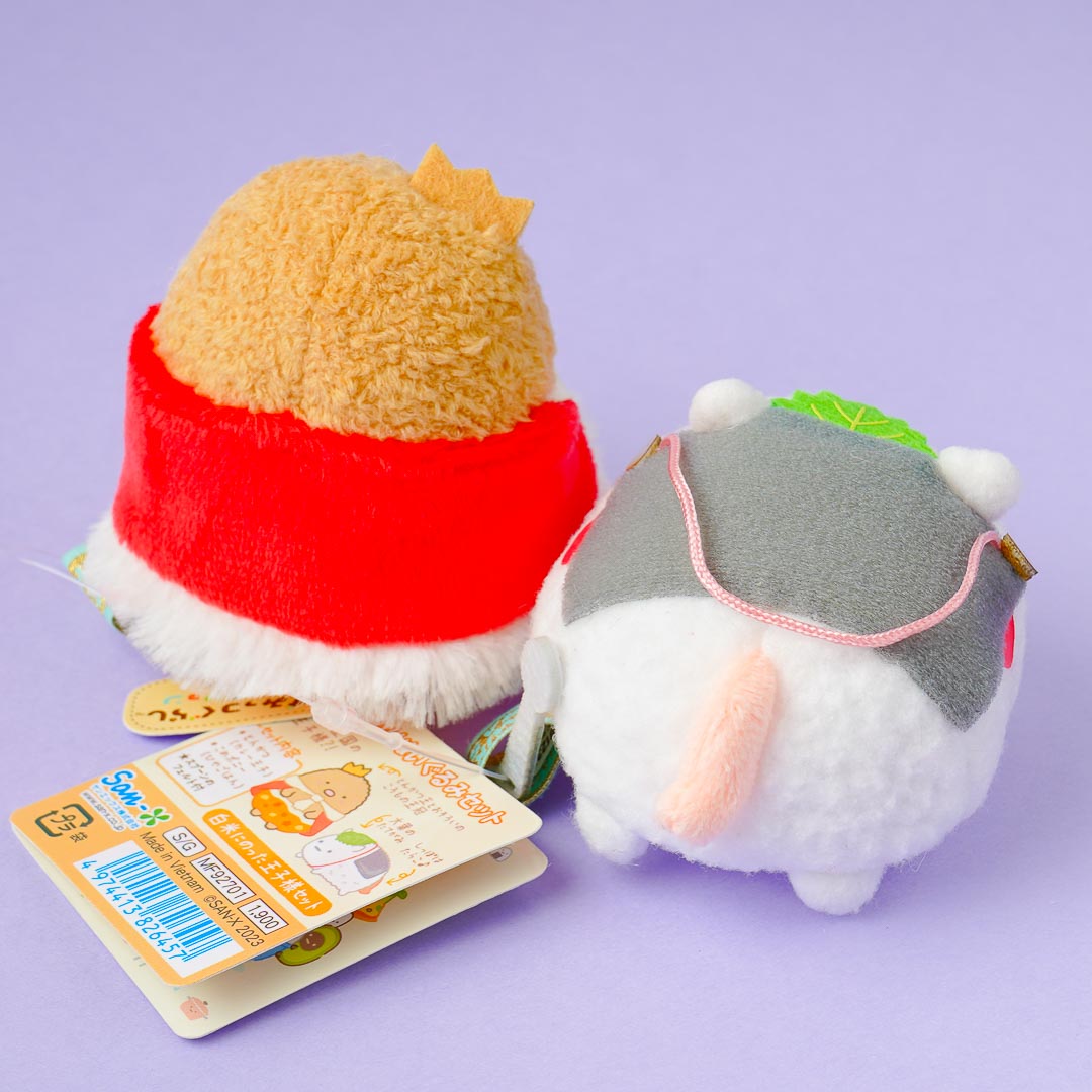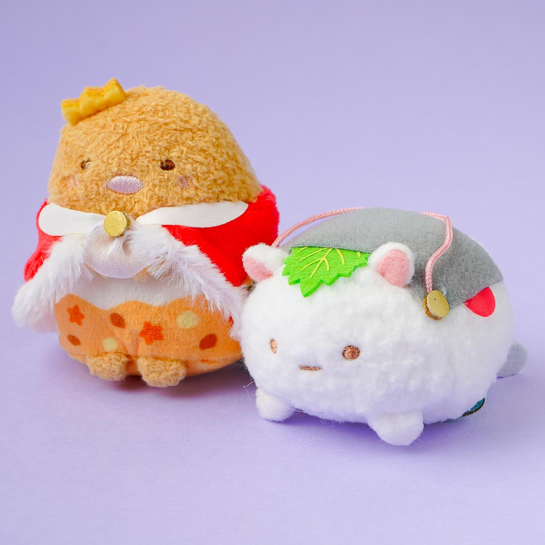 Make space in your Sumikko Gurashi collection for this super cute set of plushies! These cuties come from the Sumikko Gurashi Food Kingdom Tenori series. It includes a Tonkatsu plushie wearing a prince outfit and a White Rice plushie. You can set the Tonkatsu plushie on top of the White Rice Shiso plushie as if it were riding!