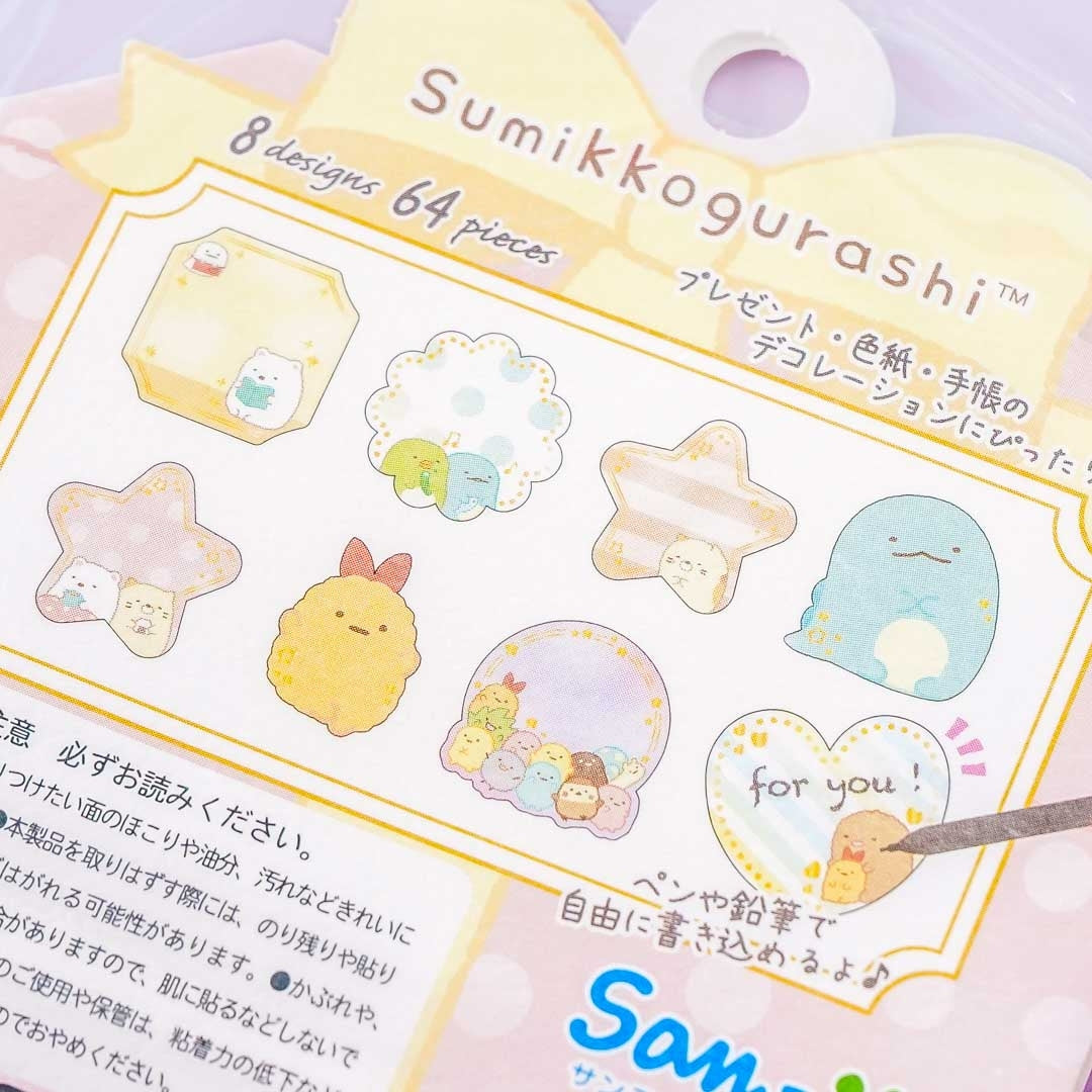 Add a short dedication to your presents using these kawaii sticker flakes with writable surfaces! These die-cut seals feature eight cute designs with prints of the Sumikko Gurashi characters having fun together! Each sticker also has golden details.