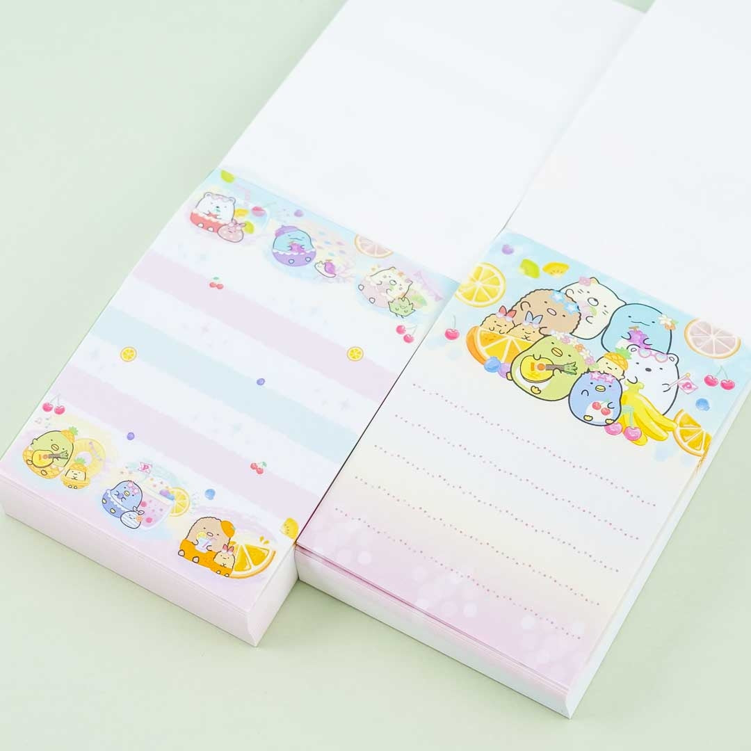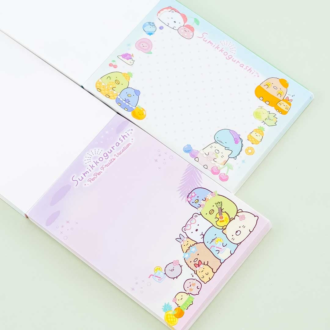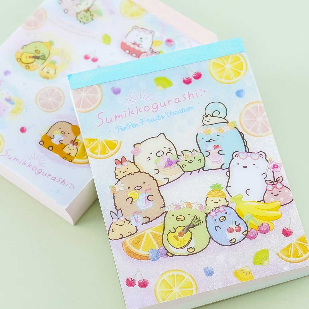 • A kawaii memo pad illustrated with the Sumikko Gurashi playing with fruits