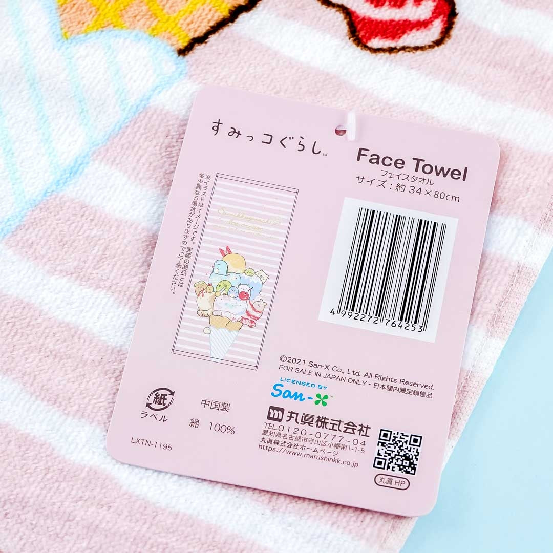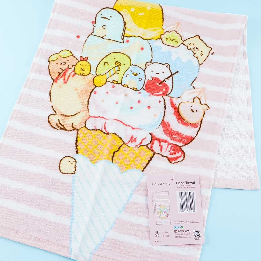 A kawaii long face towel featuring the Sumikko Gurashi characters and a big ice cream cone