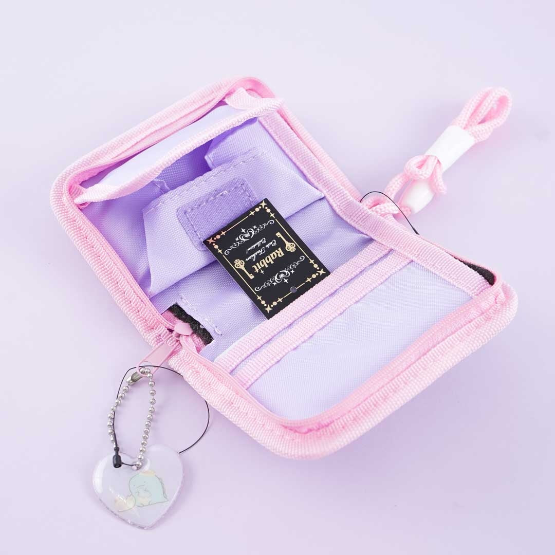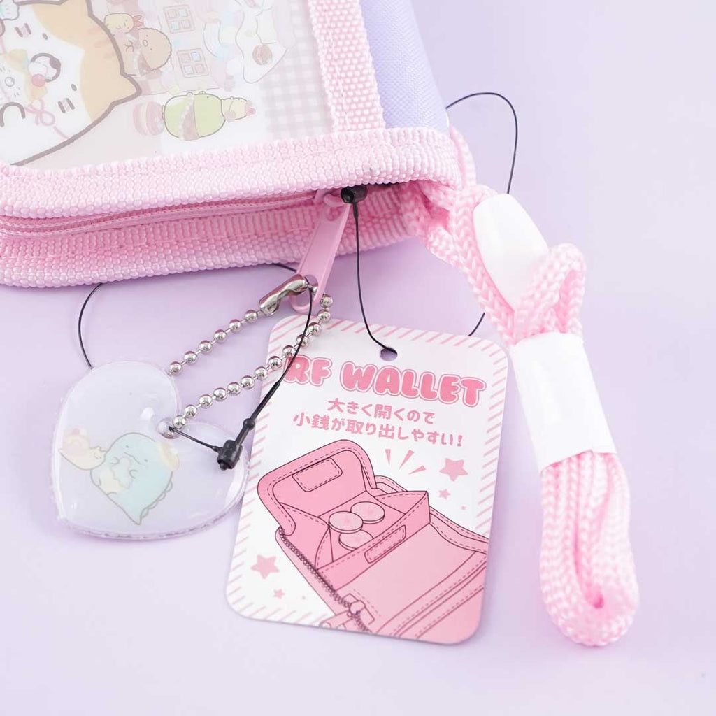 Store your loose change and cash inside this cute bi-fold wallet. It showcases the Sumikko Gurashi eating desserts outside of a ginger house! This wallet has multiple pockets, a zipper closure, an adjustable strap, and a heart-shaped charm with a removable ball chain.