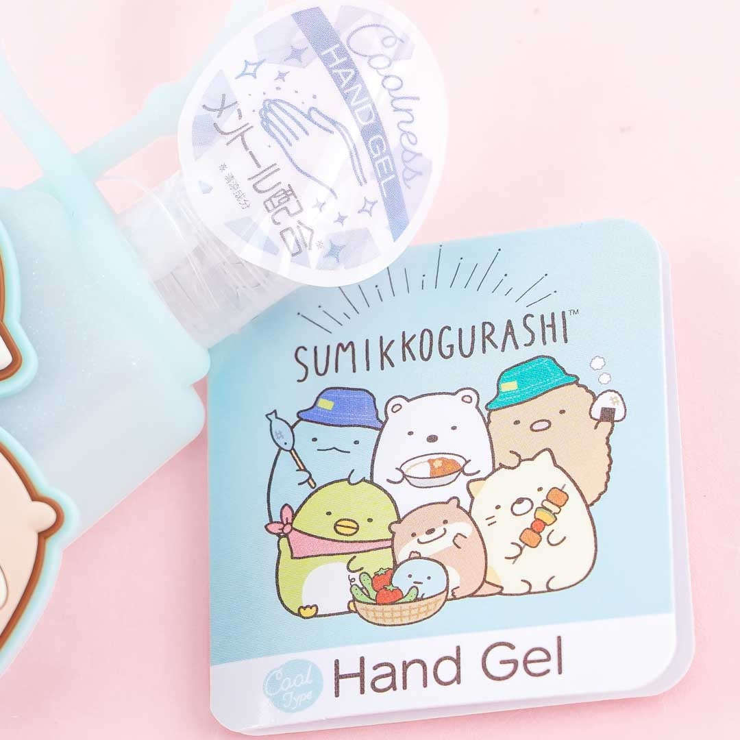 A bottle of hand gel with a silicon case illustrated with Neko and Otter from the Sumikko Gurashi