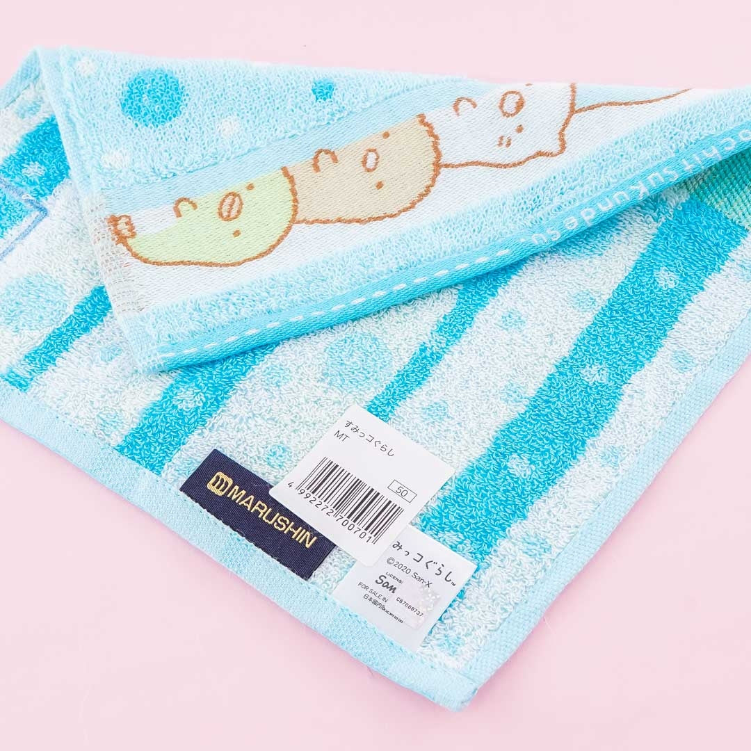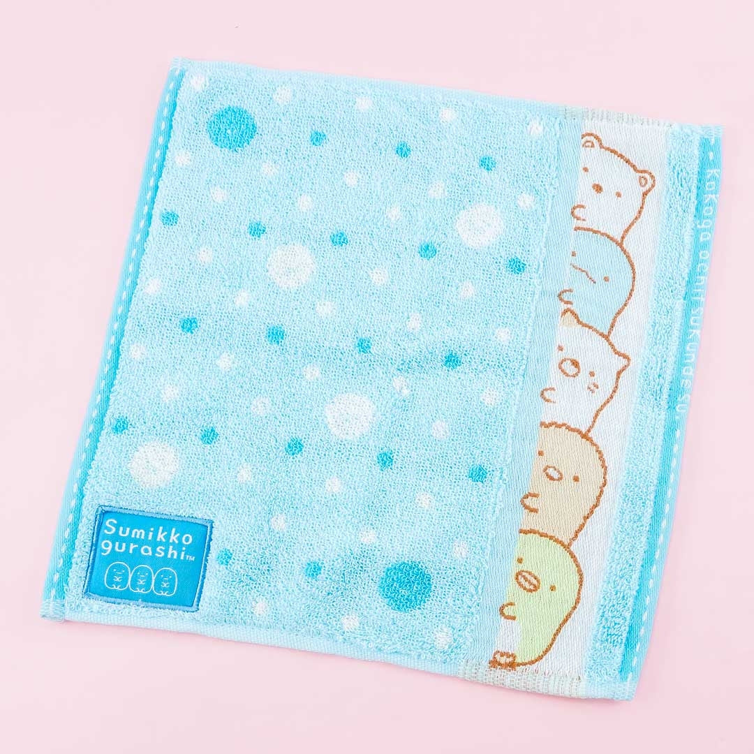 • A kawaii hand towel illustrated with the Sumikko Gurashi peeking