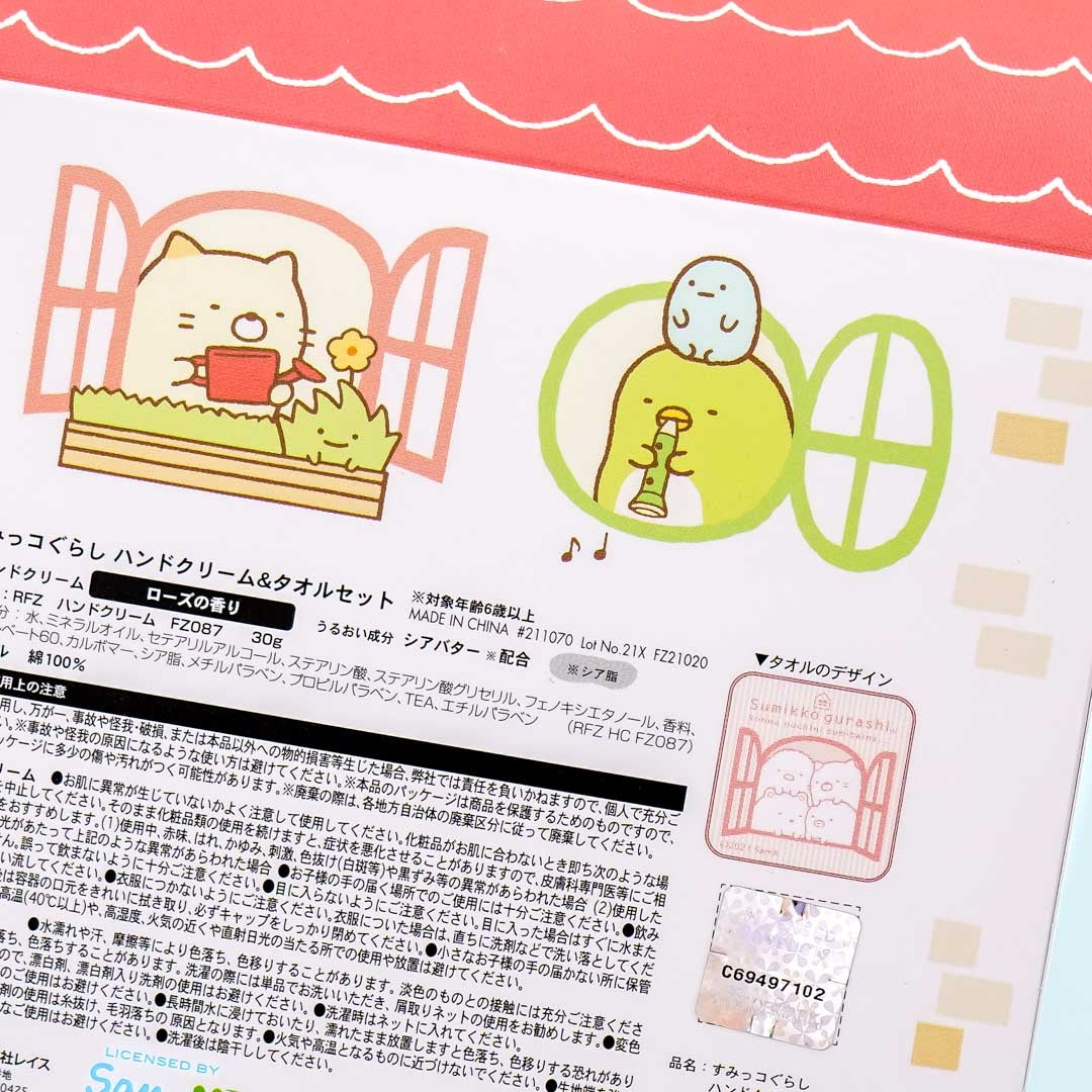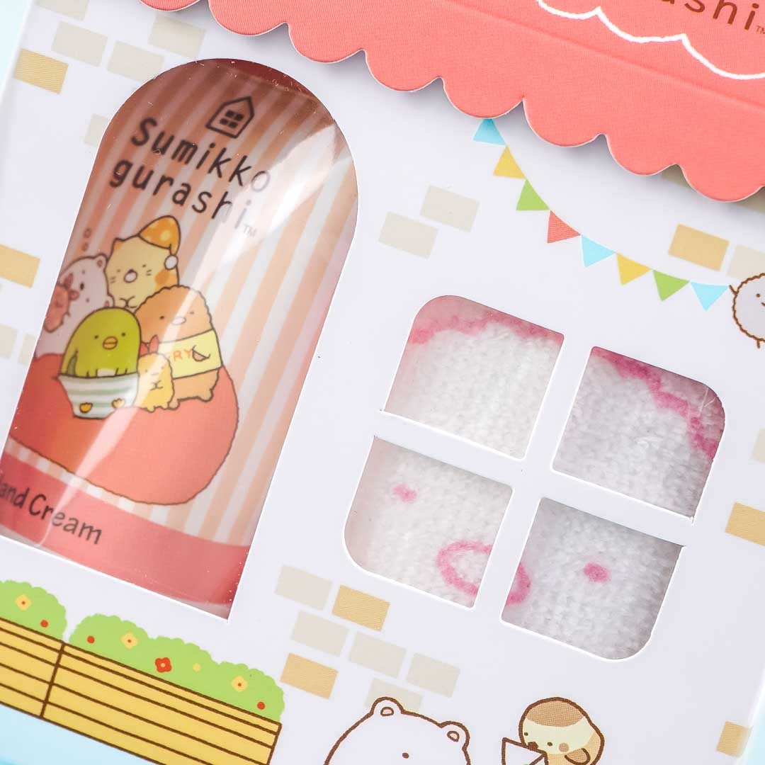 A cute hand cream and towel set showcasing the Sumikko Gurashi enjoying their time at home