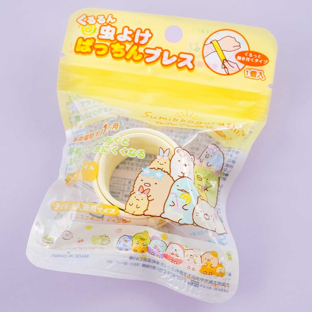 • A kawaii insect repellent slap bracelet featuring prints of the Sumikko Gurashi characters