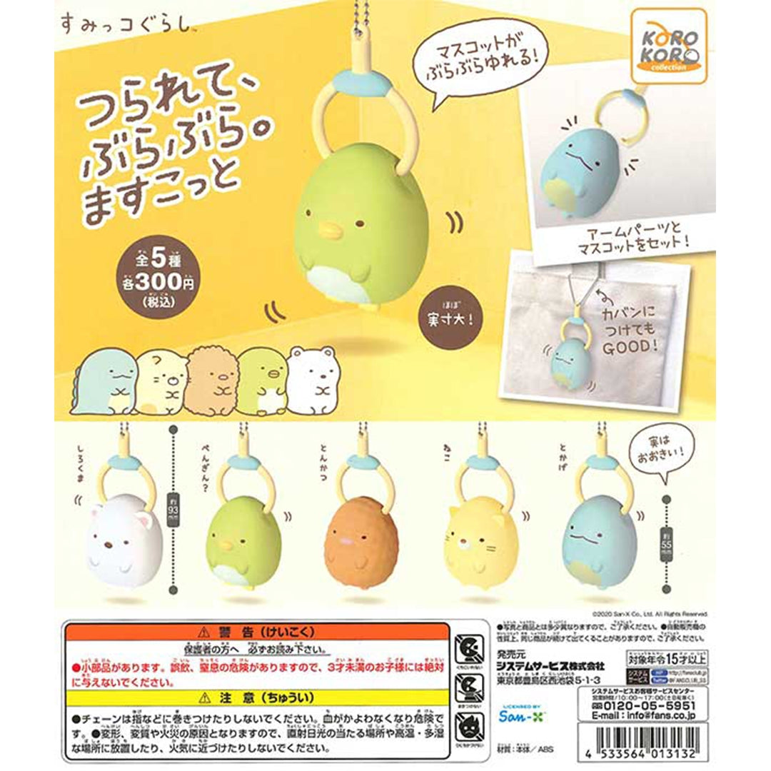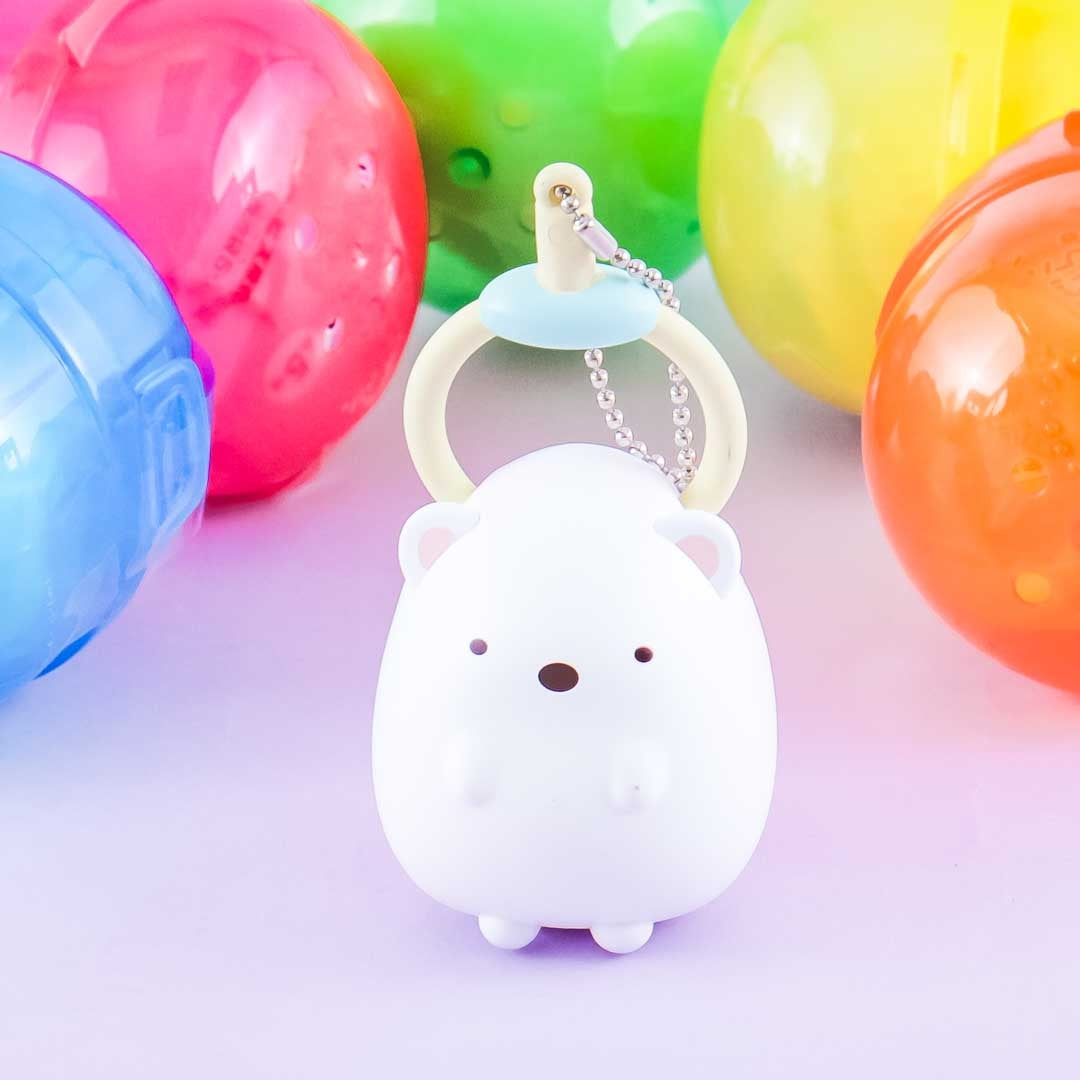 • A colorful transparent gachapon capsule with a Sumikko Gurashi character hanging from a crane game hook charm collectible