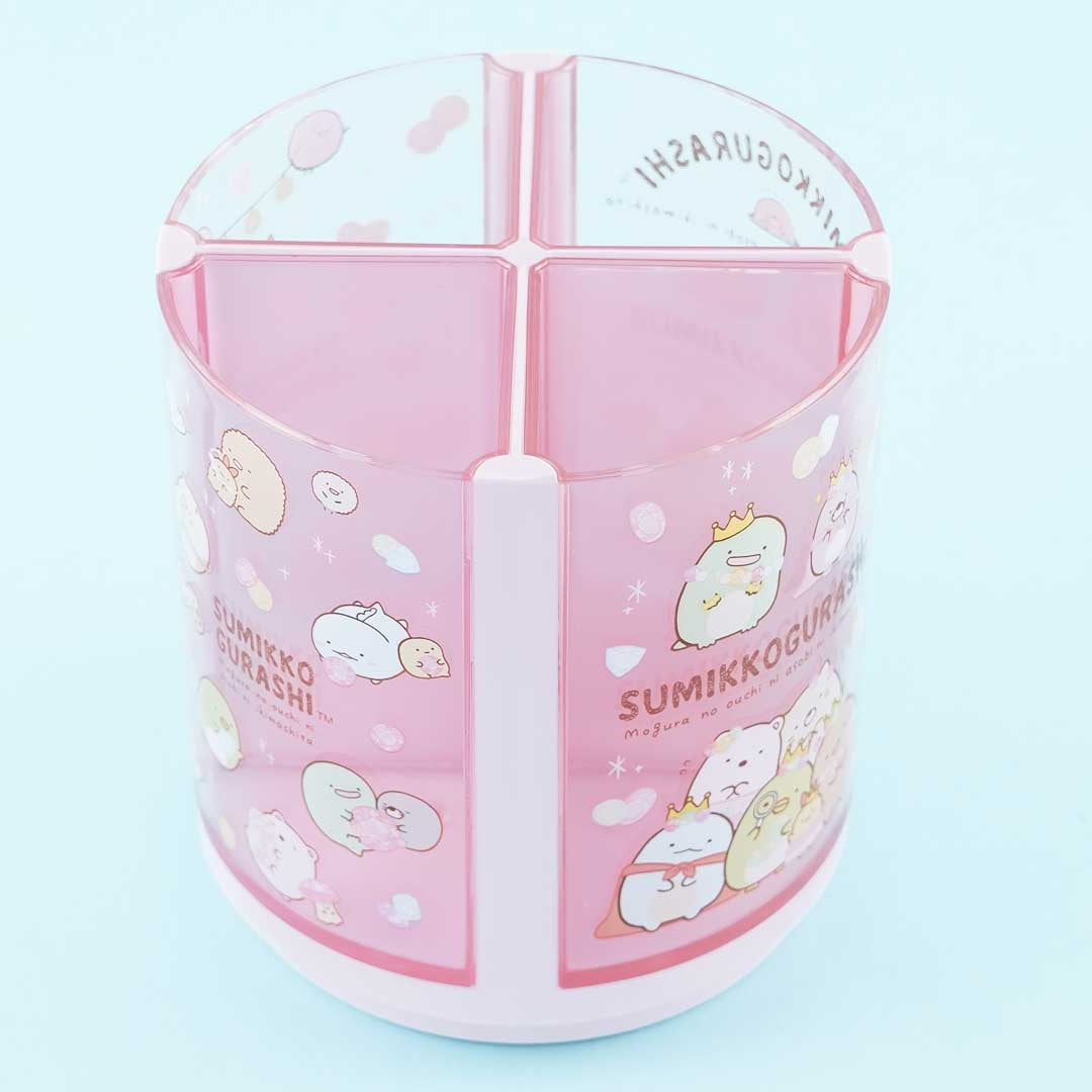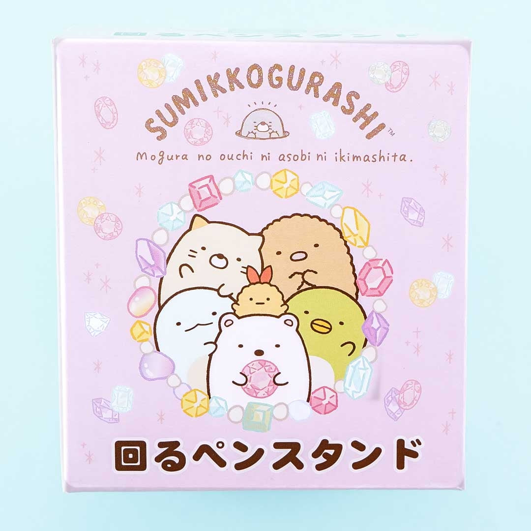 A kawaii rotating pen stand illustrated with the Sumikko Gurashi having a jewelry party