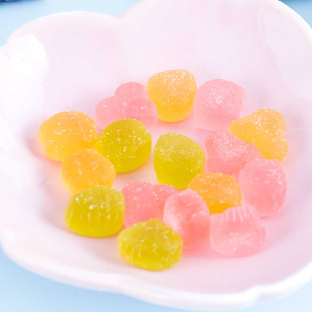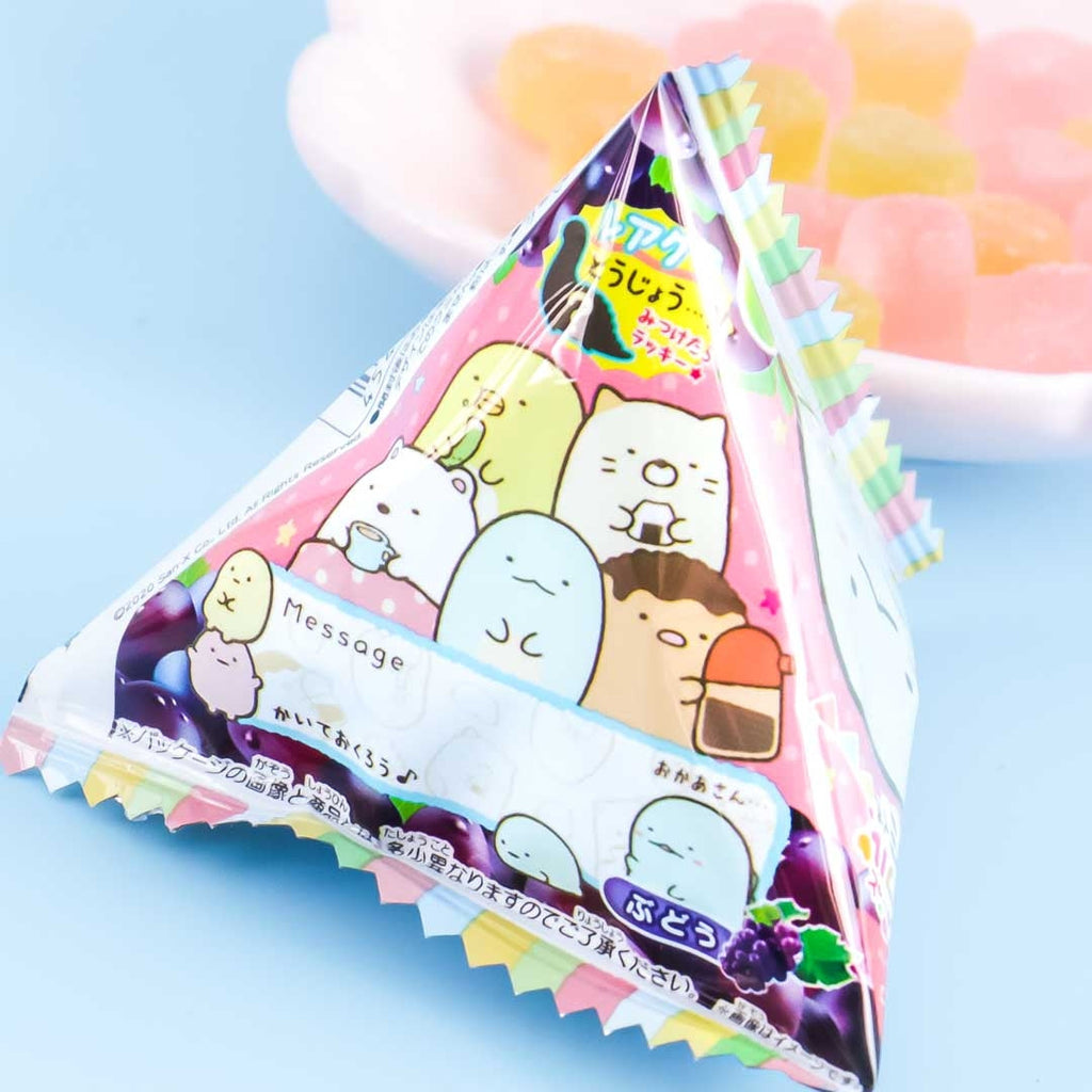 Enjoy nibbling on these mini grape-flavored colorful gummies shaped like Sumikko Gurashi characters! These pink, green, and orange-colored treats come in a triangular tetra pack that features these cuties as well. You’ll receive a random pack design when you order.