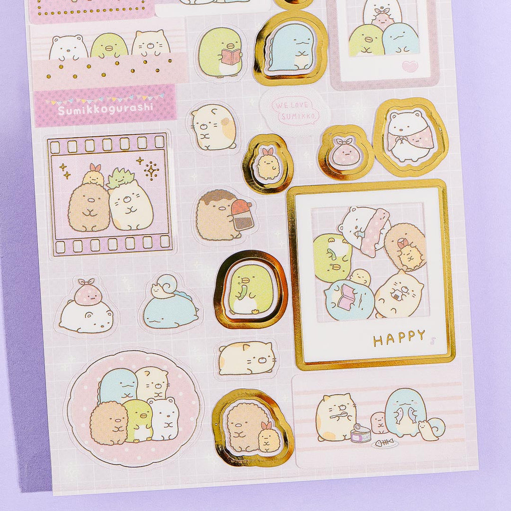 Add this cute sticker sheet to your stationery collection! It features die-cut illustrations of the Sumikko Gurashi gang reminiscing about different memories through photographs! Some of the seals also come with gold foil detailing.