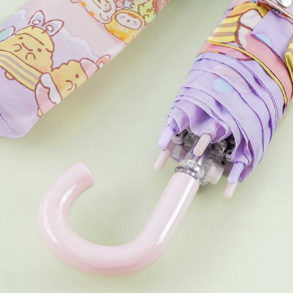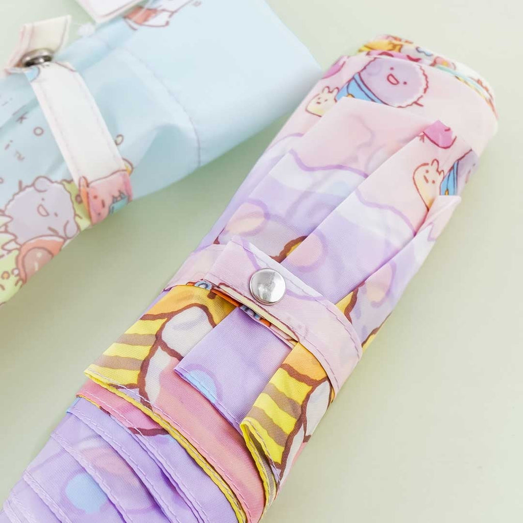 Stay dry on rainy days with this super cute pastel-colored umbrella featuring the characters from the "Sumikko Gurashi Minikko To Asobo" series. This windproof compact umbrella has a curved handle and comes with a carrying case. Simply fold and secure it with its button closure.