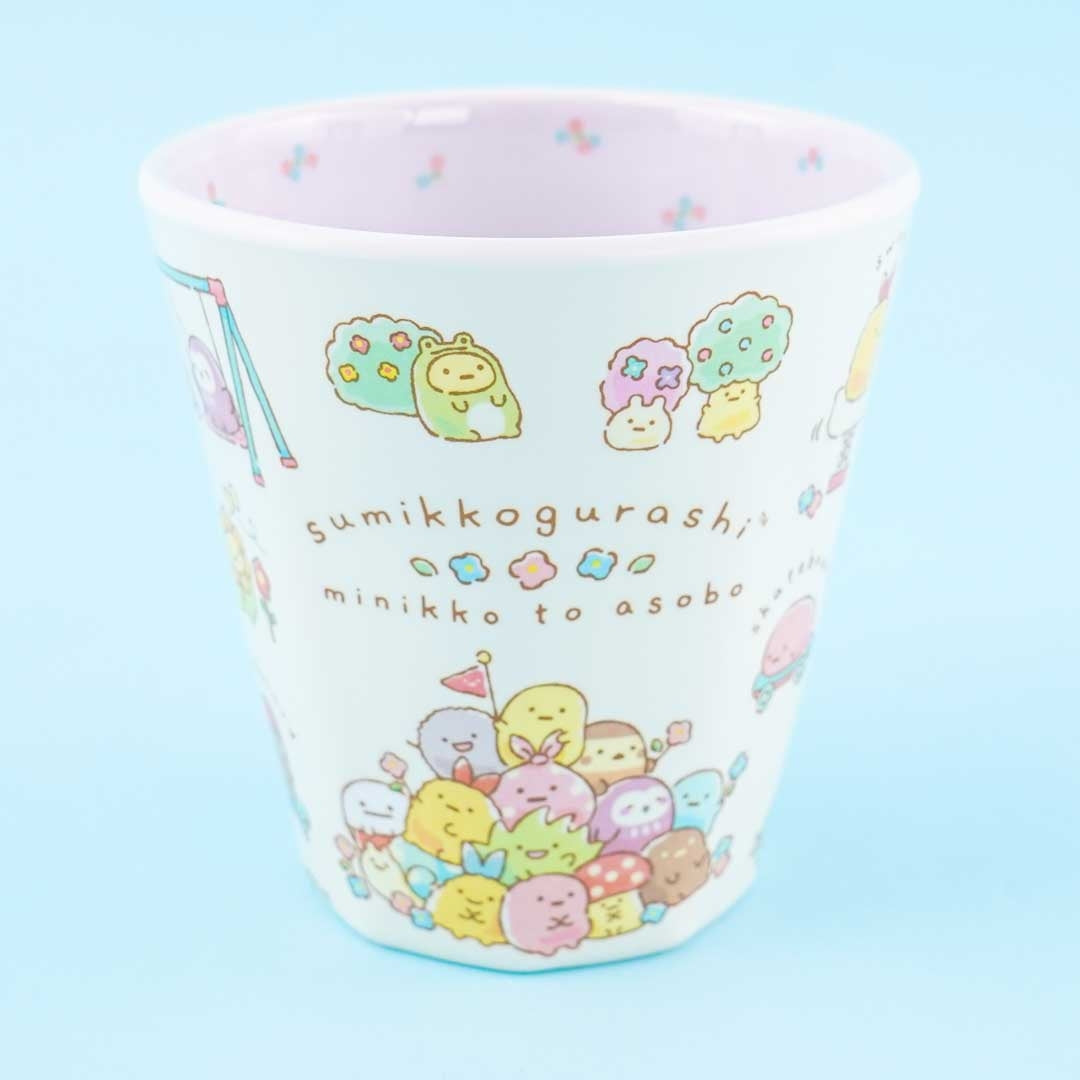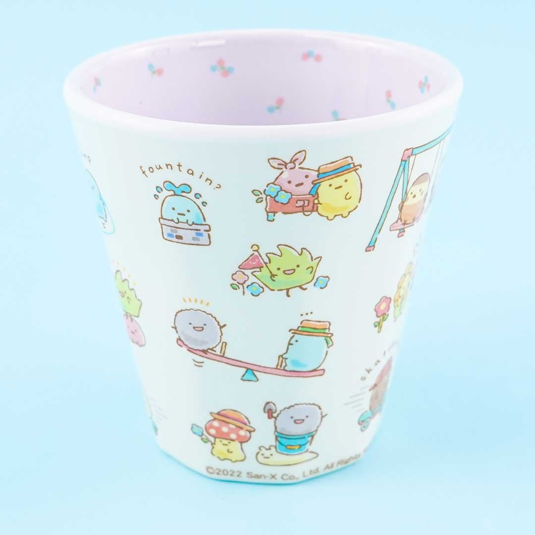 A drinking cup with kawaii prints of the Sumikko Gurashi characters from the Minikko To Asobo collection
