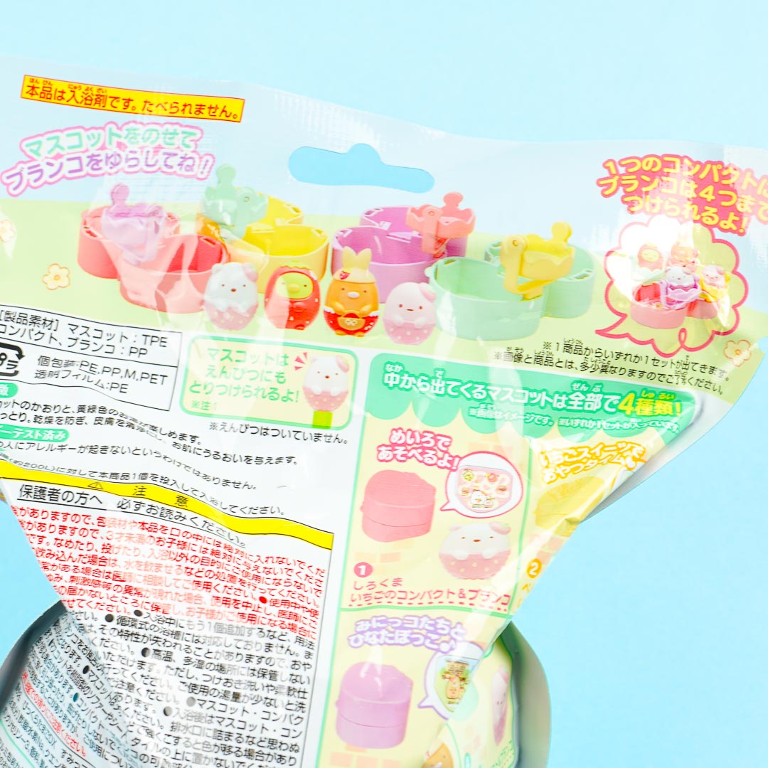 This muscat-scented bath ball lets you play in the bath! It comes with a 3-piece compact set that features a swing and a Sumikko Gurashi character figure. Collect them all to complete the swing set! When the yellow-green fizzy bath salt melts, a surprise egg with a random toy design appears!