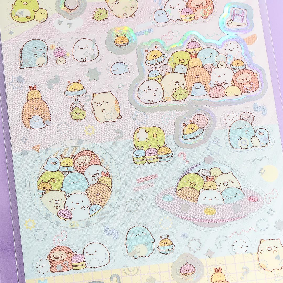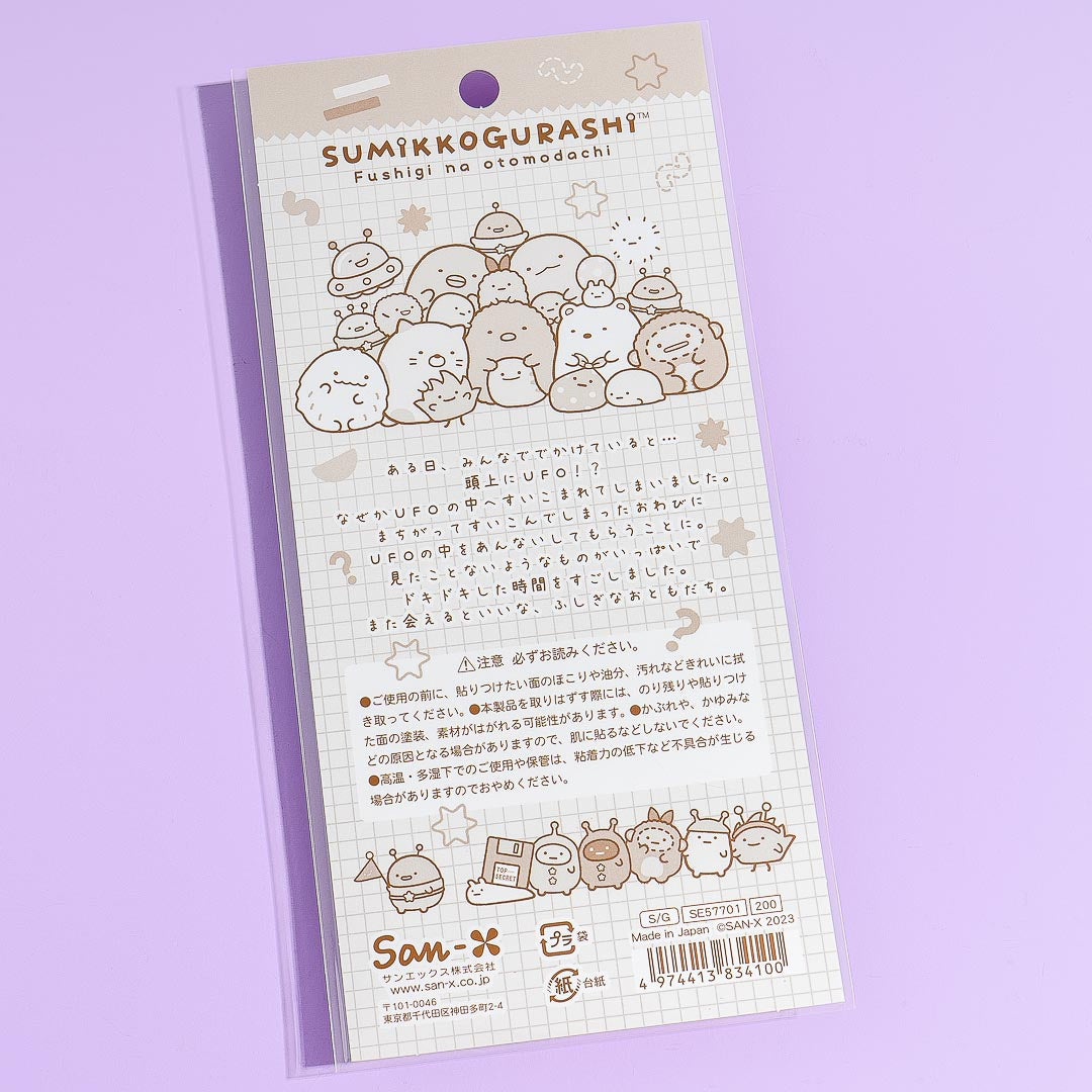 This super kawaii sheet of stickers showcases the Sumikko Gurashi hanging out with their mysterious friends from space! It comes from the Sumikko Gurashi "Fushigi na Otomodachi" or "Mysterious Friends" series. Use them to accessorize your notebook covers. You can stick them on your cellphone case, on your planner, and anywhere you want.
