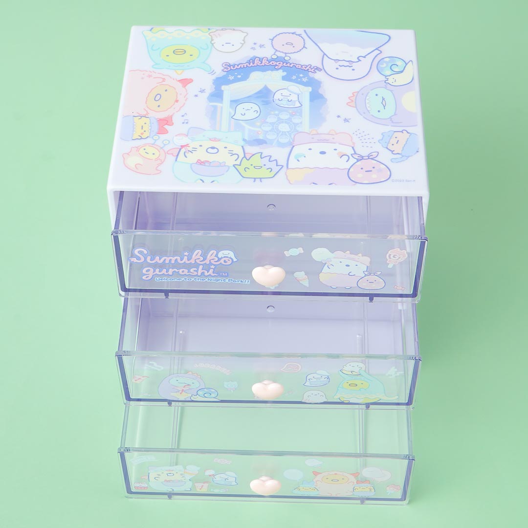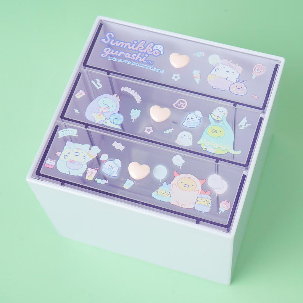 Kawaii-fy your work area with this cute 3-tier pull-out chest! It features prints of Sumikko Gurashi characters in their pj's with tons of sweets. Each drawer is clear so you can easily organize your pens, memo pads, and stationery sets.