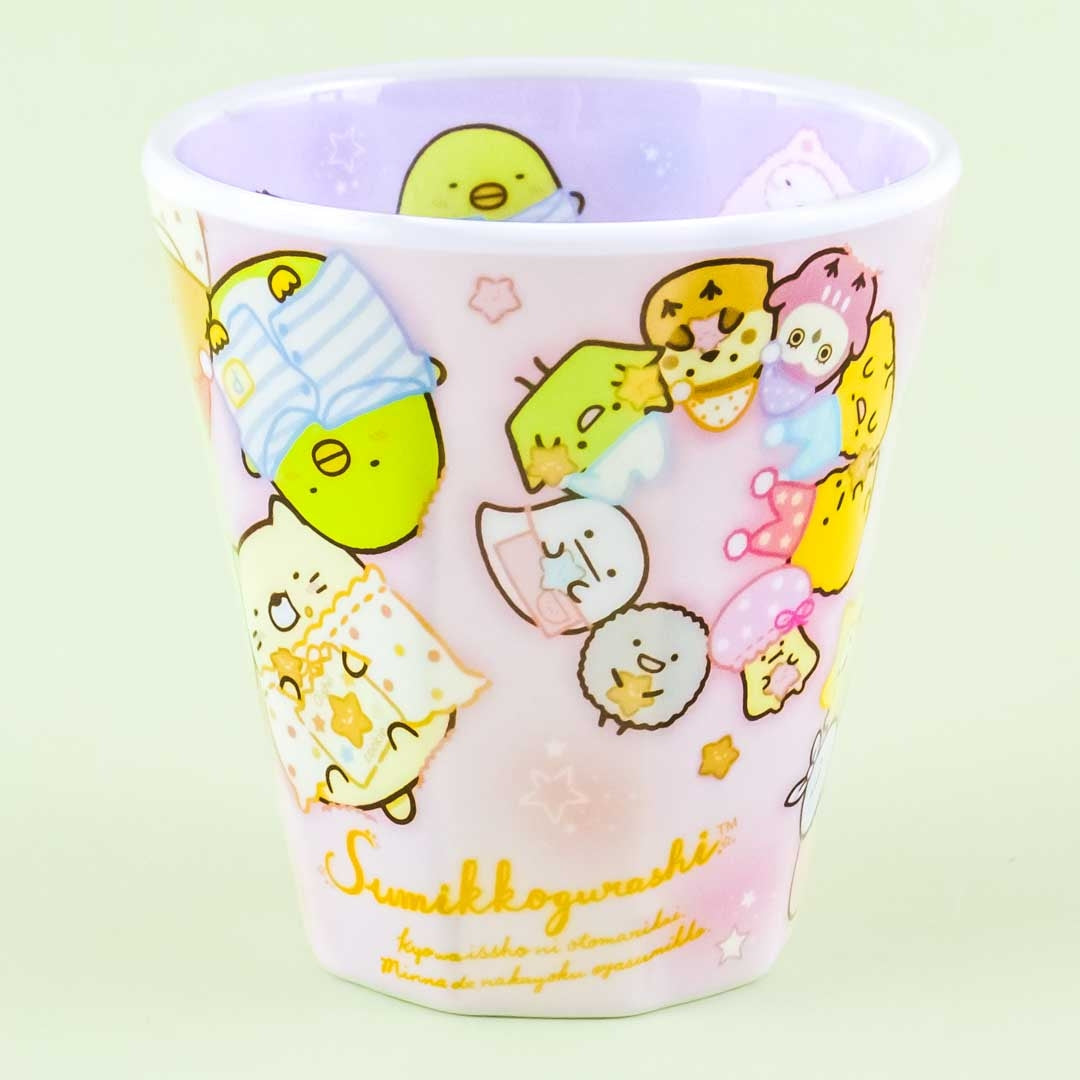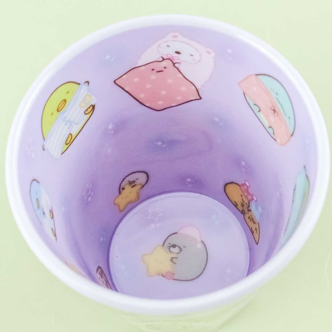 A kawaii cup featuring the Sumikko Gurashi gang in a slumber party