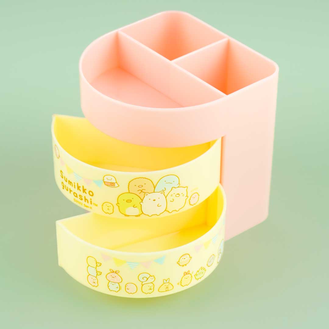 Keep your makeup brushes, blenders, and sponges organized by using this super cute case! It has kawaii prints of the Sumikko Gurashi gang having a fun party! This unique organizer has two separate sections for brushes, an upper shelf, and two pull-out drawer trays.