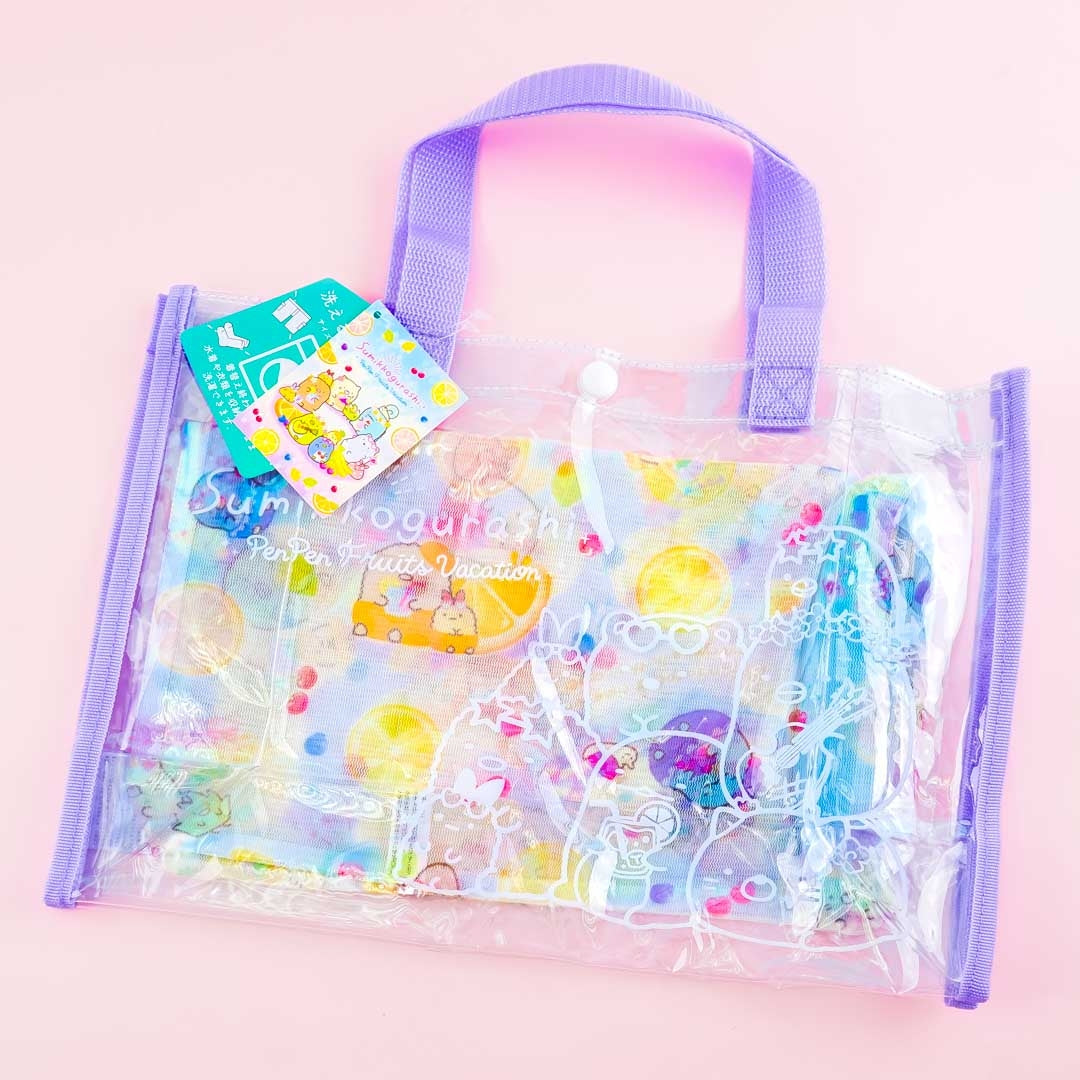 This super cute clear vinyl tote bag features prints of the Sumikko Gurashi with flowers and fruits! It comes with a laundry pouch that you can use for your clothes. Take it with you when you head to the pool!