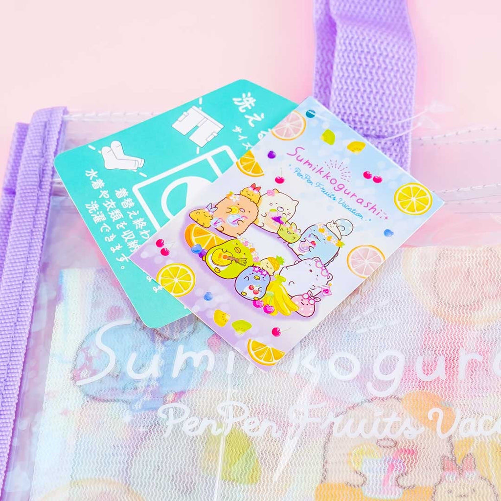 A kawaii clear vinyl tote bag illustrated with the Sumikko Gurashi carrying flowers and fruits