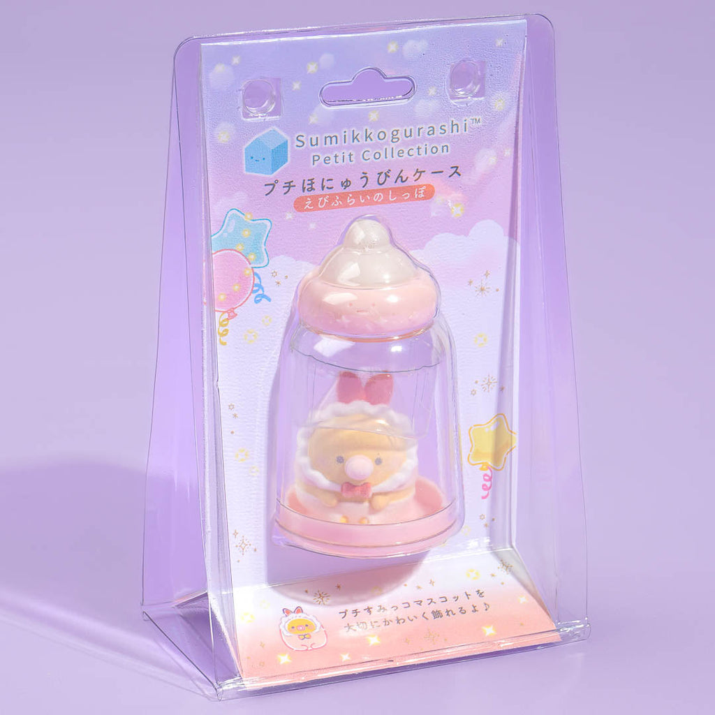Kawaii-fy your shelf or side table with this super cute figure from the “Sumikko Gurashi Petit Collection.” It features Ebifurai No Shippo dressed as a baby and inside the giant baby bottle. You can either display this soft figure with or without the bottle!