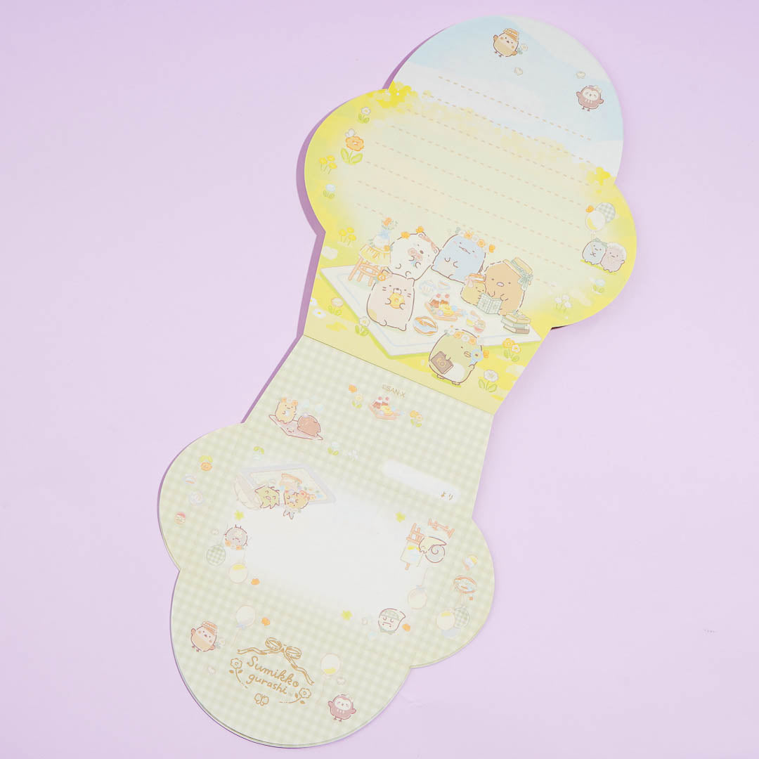 Write short notes on this kawaii memo pad! It showcases illustrations of Sumikko Gurashi having a picnic. This die-cut mini memo pad has a PVC cover, a sticker sheet, and two sheet patterns. Some sheets can even be folded into a mini envelope!