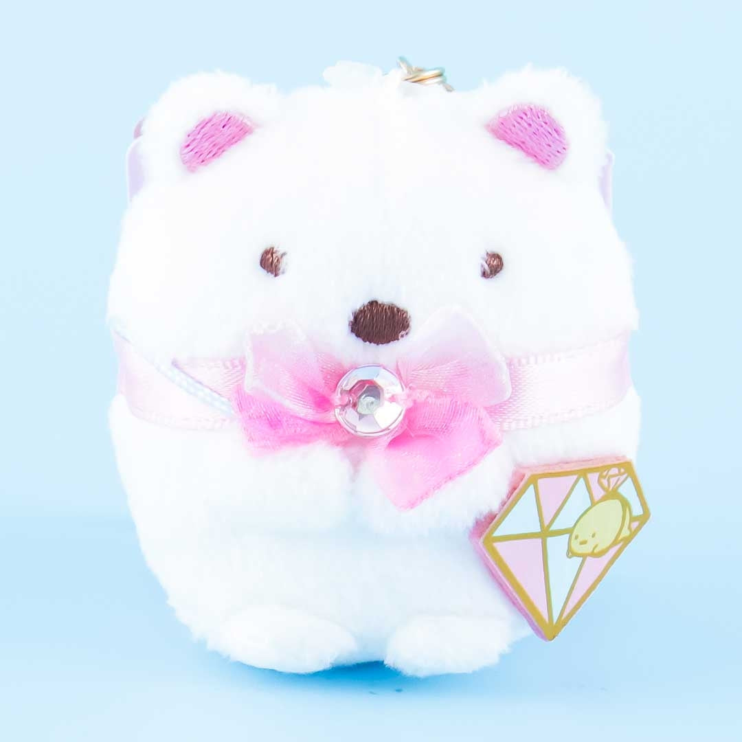 Attach this super kawaii Shirokuma plushie charm to your favorite bag with its metal clip! This mini-sized cutie from the Sumikko Gurashi is wearing a sweet pink ribbon with a rhinestone in the center. You can also attach keys to this cute plushie!