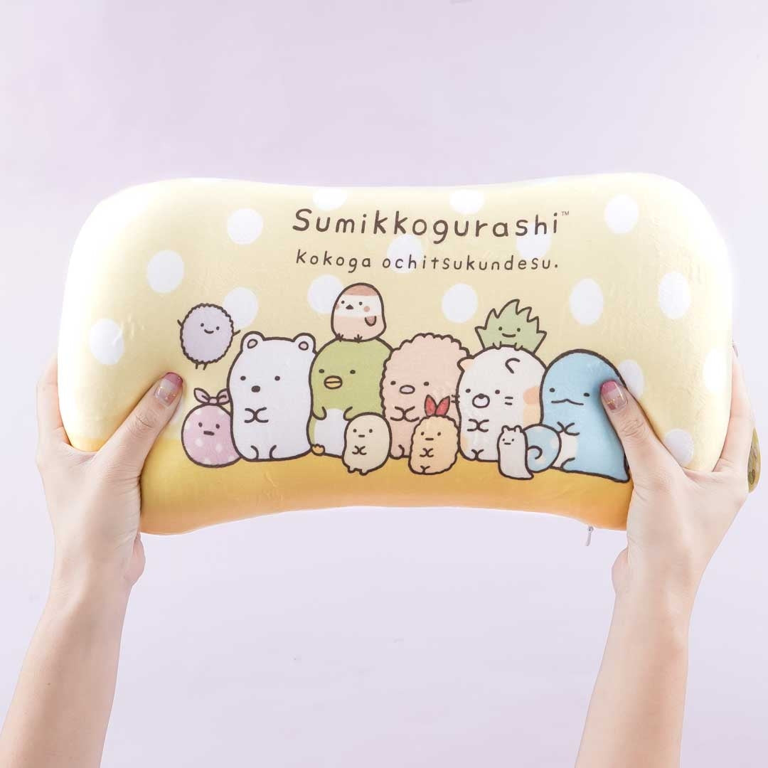 This compact pillow is made of a combination of special materials that provide pressure relief and great support both for your head and back! It’s decorated with lots of polka dots and illustrations of the Sumikko Gurashi characters facing front on one side, and turned backward on the other. Use this cute cushion when you need to take a quick nap!