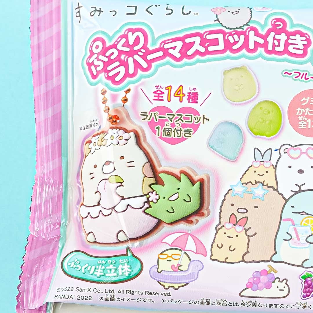 Have fun trying out these colorful grape-flavored “pukkuri” or plump gummies shaped like Sumikko Gurashi characters dressed as fruits! This second character gummy series also comes with a free rubber charm with a removable ball chain. You’ll receive a random set of gummy shapes out of thirteen types, as well as a random character charm out of fourteen possible designs when you order!