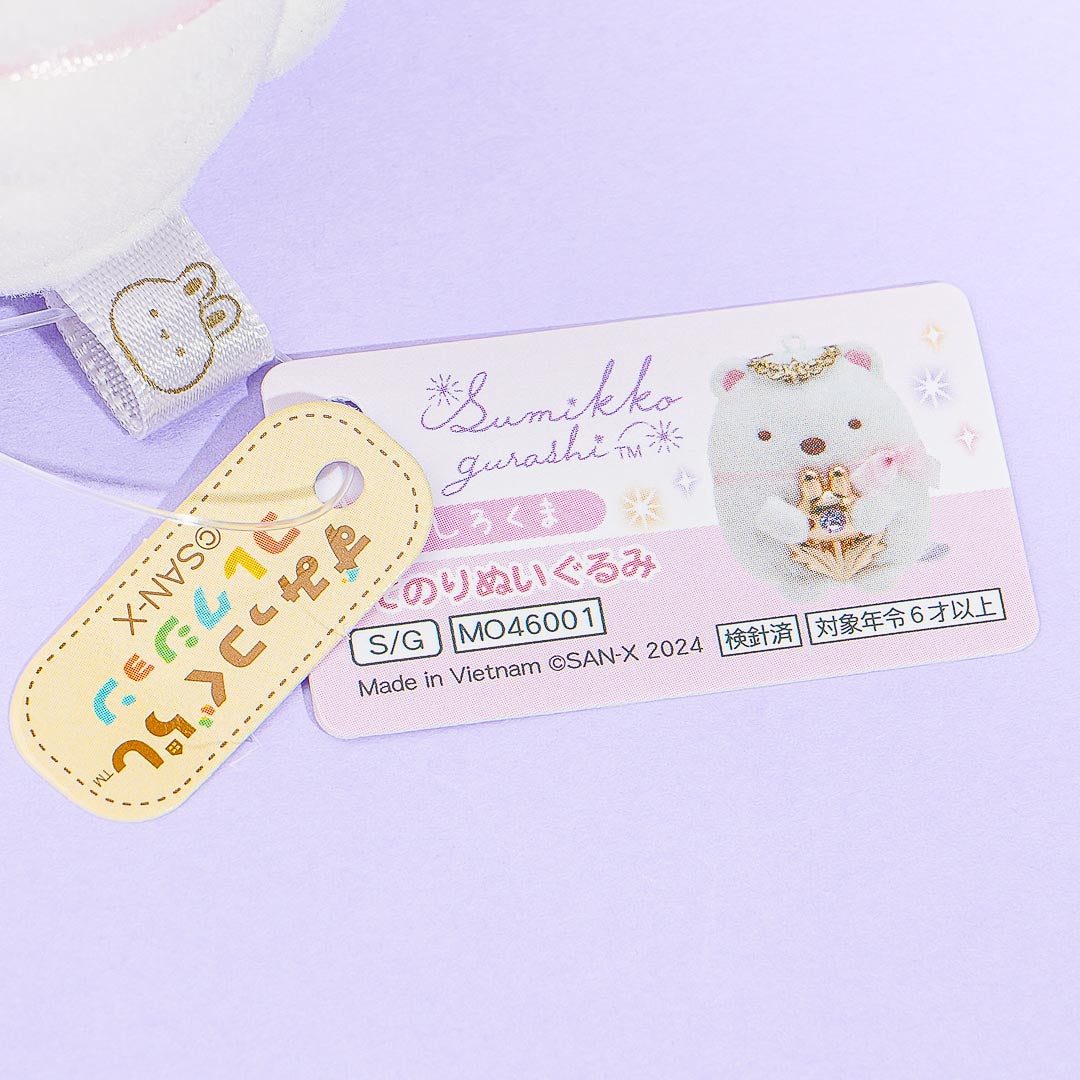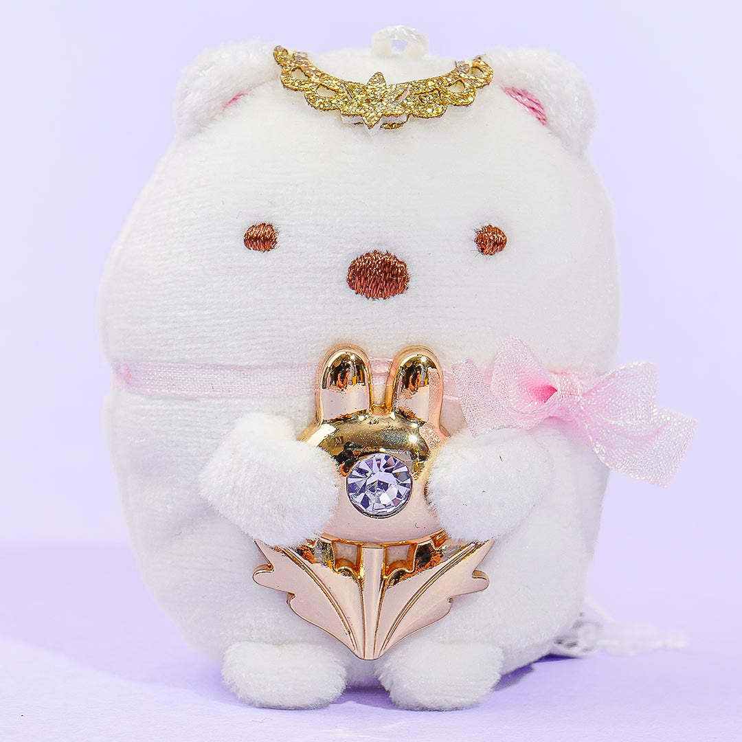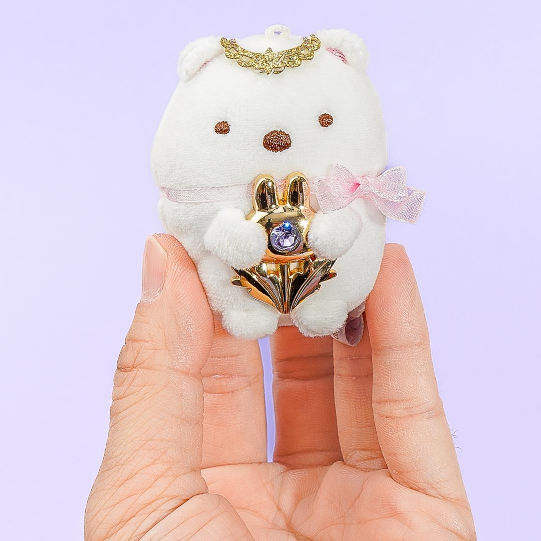 The Sumikko Gurashi gang is reunited with the magical rabbit meister! This super cute Shirokuma tenori plushie is wearing a golden crown and holding a metal rabbit charm. The charm is adorned with a cute and sparkly rhinestone. Have fun playing with this mini-sized stuffed toy!