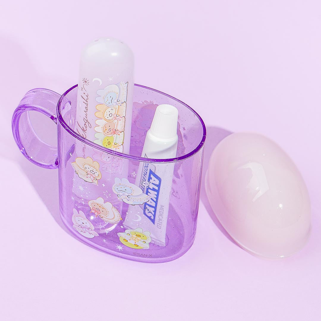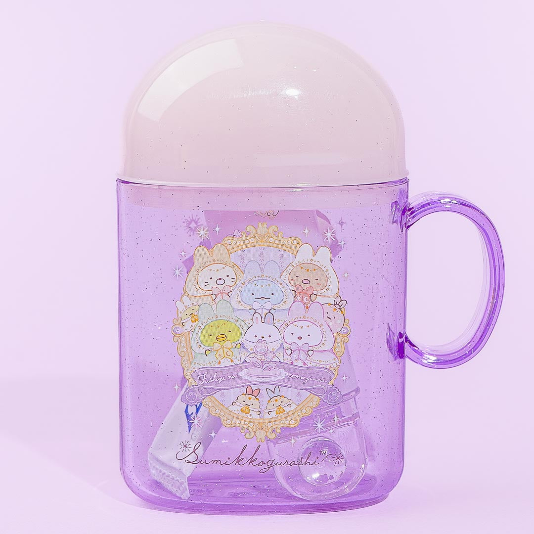 Keep your teeth clean and breath fresh with this kawaii toothbrush kit! It features cute illustrations of the Sumikko Gurashi gang wearing rabbit hoodies. This set includes a clear plastic cup with a lid, a travel toothbrush, and a tube of toothpaste.