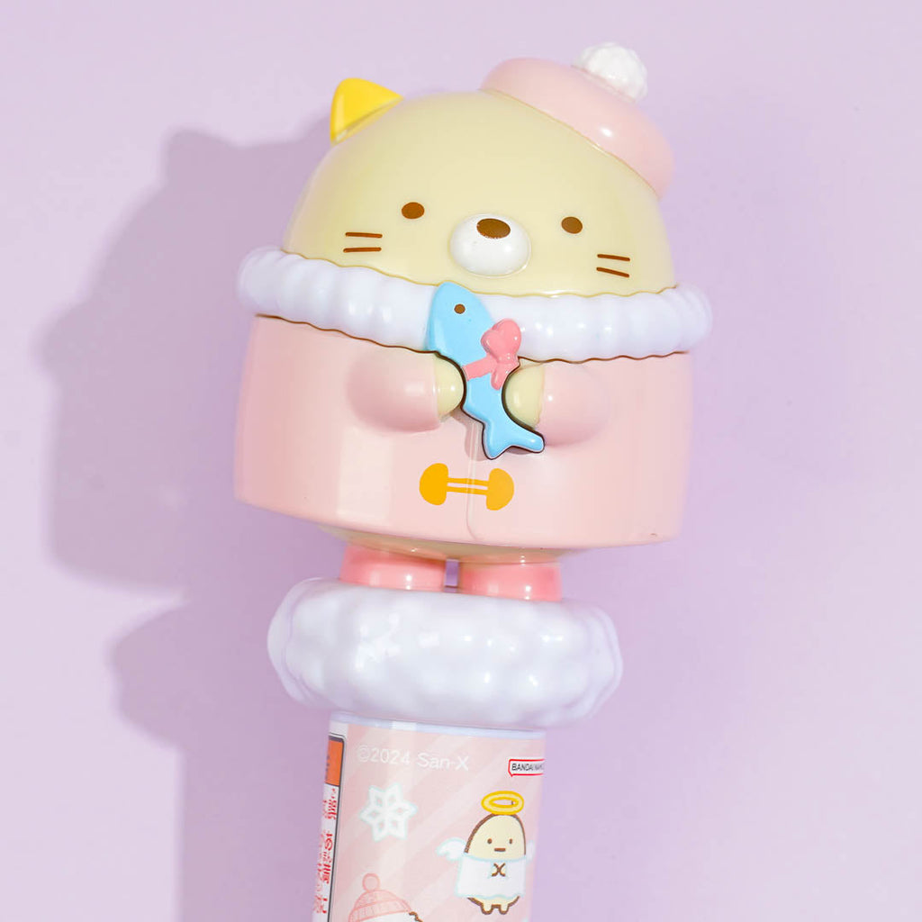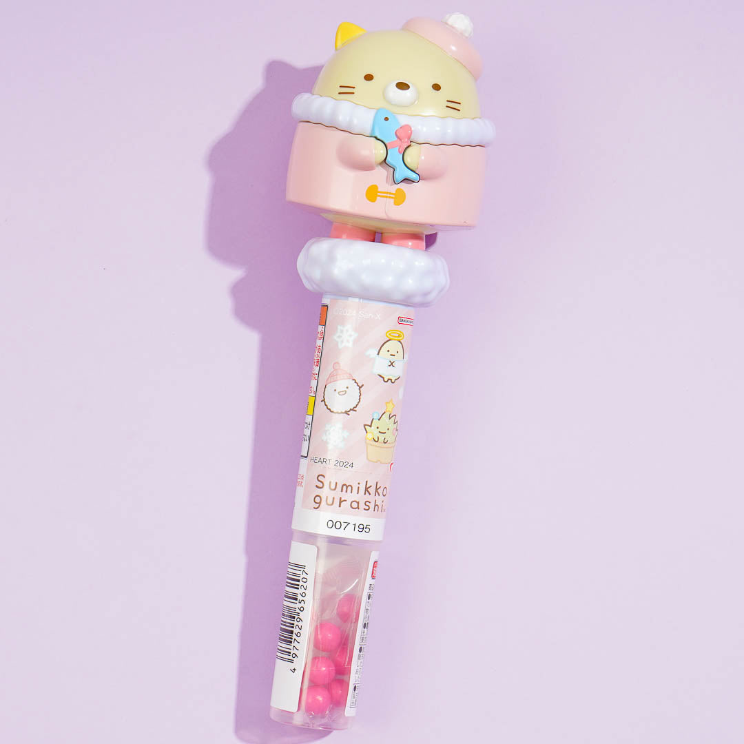 In Japan, ramune is a popular carbonated soft drink that everyone enjoys. Have a taste of it with this tube of grape-flavored ramune candy! It has a cute little Sumikko Gurashi handbell that makes a sound whenever you shake the candy tube.