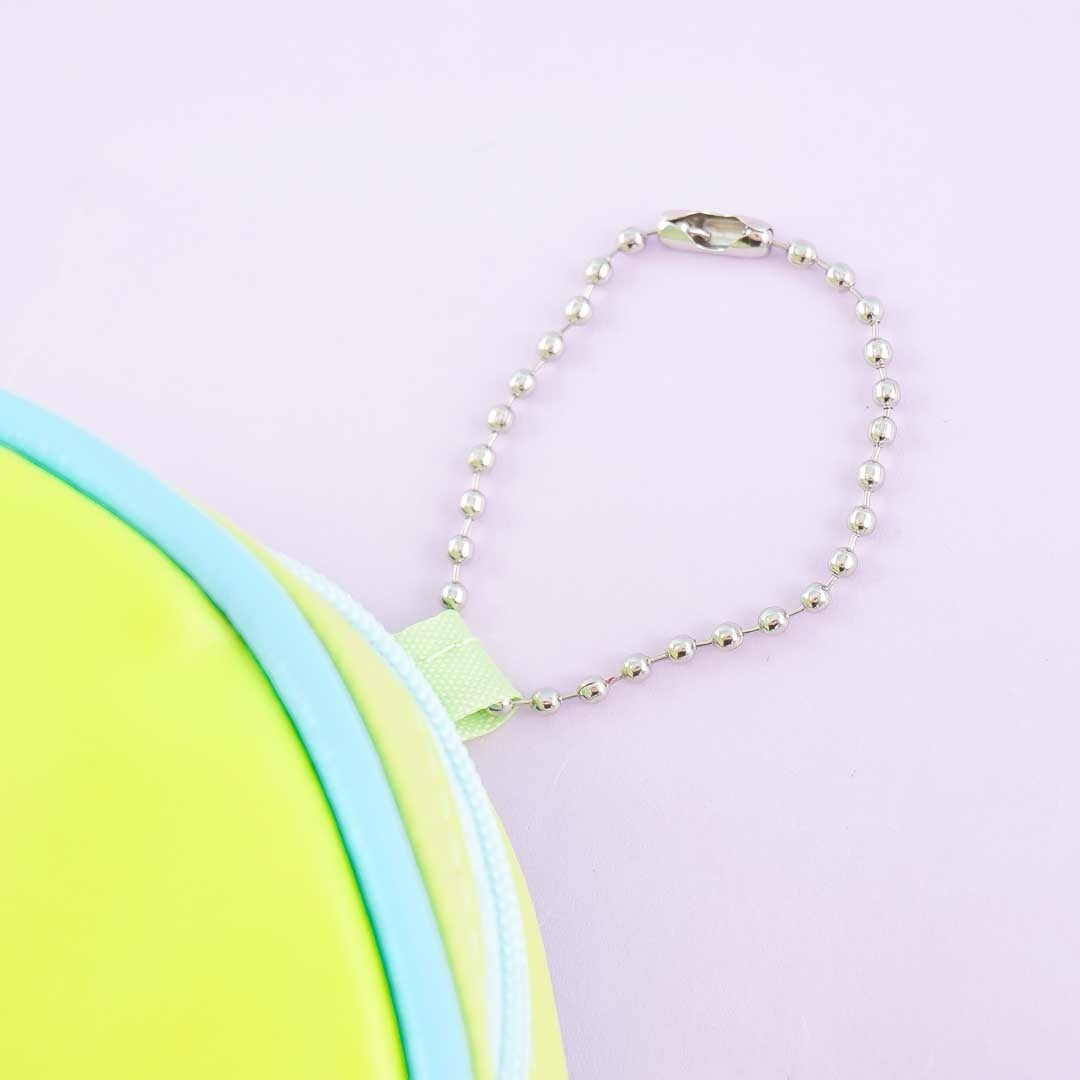 Features a zipper closure and a removable ball chain