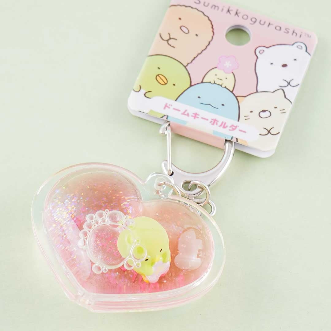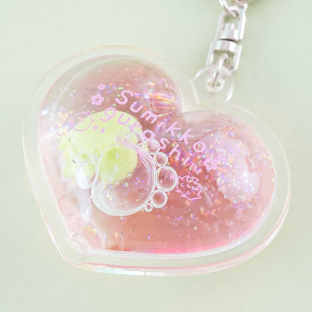 Attach this super kawaii heart-shaped Sumikko Gurashi charm to your favorite bag with its metal clip! Inside this transparent charm is a movable Penguin? figure holding a sakura blossom. It also has glitter inside!