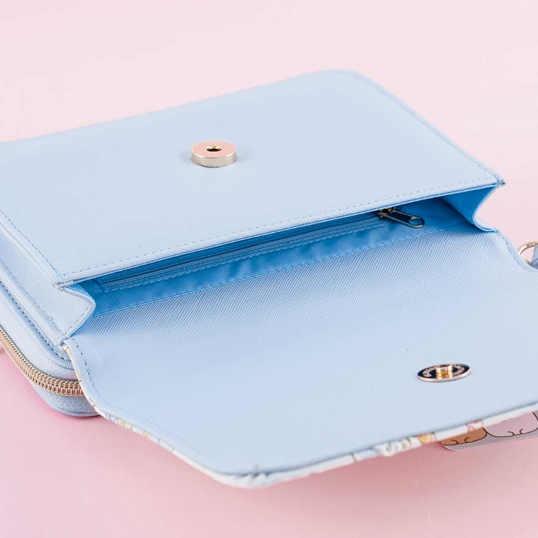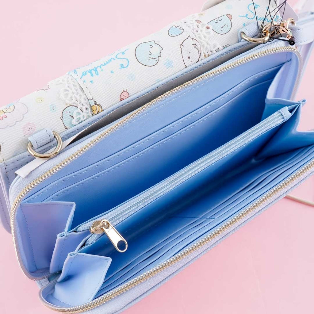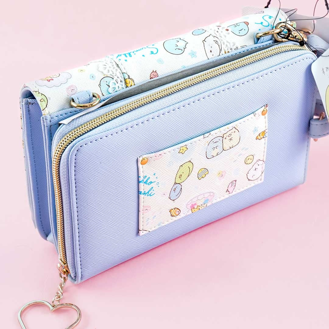 A cute sling bag that has an attached sky blue wallet decorated with prints of the Sumikko Gurashi gang under the sea