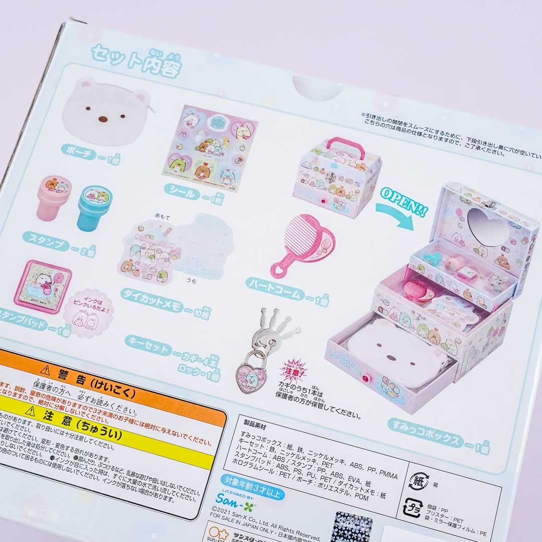This cute treasure box illustrated with prints of the Sumikko Gurashi playing together has a lot of surprises! It has three different levels, the first of which has a heart-shaped mirror and the last of which has a luxurious drawer. Inside is a heart-shaped comb, a hologram sticker, a memo, two stamps, a stamp pad, a pouch, and a key set. You can also give this secret box to your best friend as a gift!